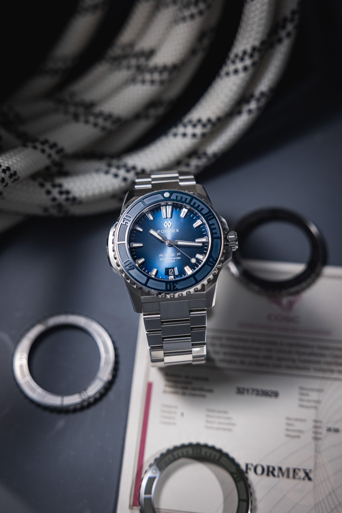 The case features a stainless steel interchangeable bezel. This is a fun detail that many, like yours truly, love, and I wouldn’t mind changing the watch’s look. Formex offers six dial colors (dark blue, green, white, black, bronze, and light blue) that you can match with five bezels featuring dark blue, green, black, light blue, and stainless steel inserts. These options open up a world of possibilities. For instance, I love the Reef with a bronze dial and could see myself switching between the bezels with black and stainless steel inserts, as both suit the watch but change the look completely.