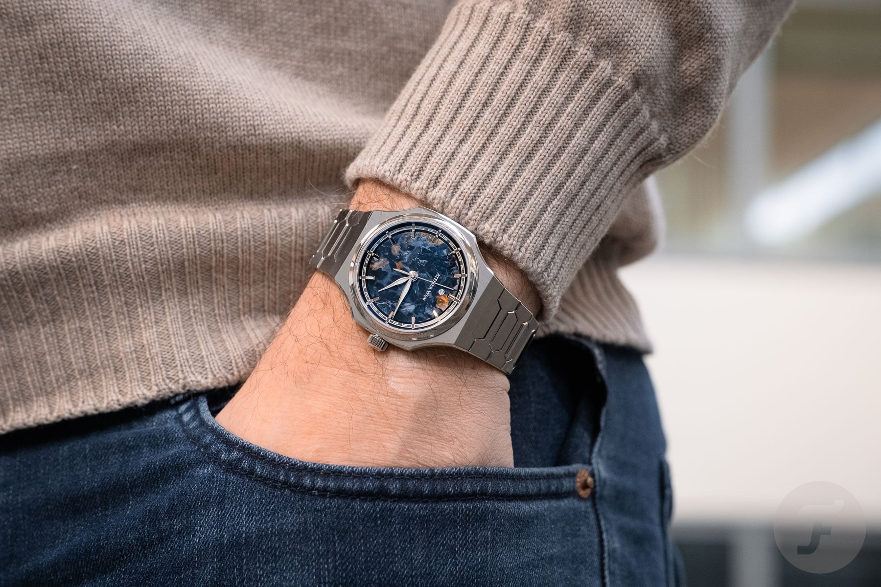 The dial sits inside the familiar 40mm 904L stainless steel case, which has a 9.4mm profile and 47mm lug-to-lug. Protecting the unique dial is a double-domed sapphire crystal with 10 layers of antireflective coating. This ensures you can fully enjoy the natural impact of the wonderful dial. Encircling the pietersite is a luminous huiwen-patterned chapter ring that also holds the hour markers. If you look closely at the special cutouts for the indexes, you get a good idea of how much work goes into creating the dials.