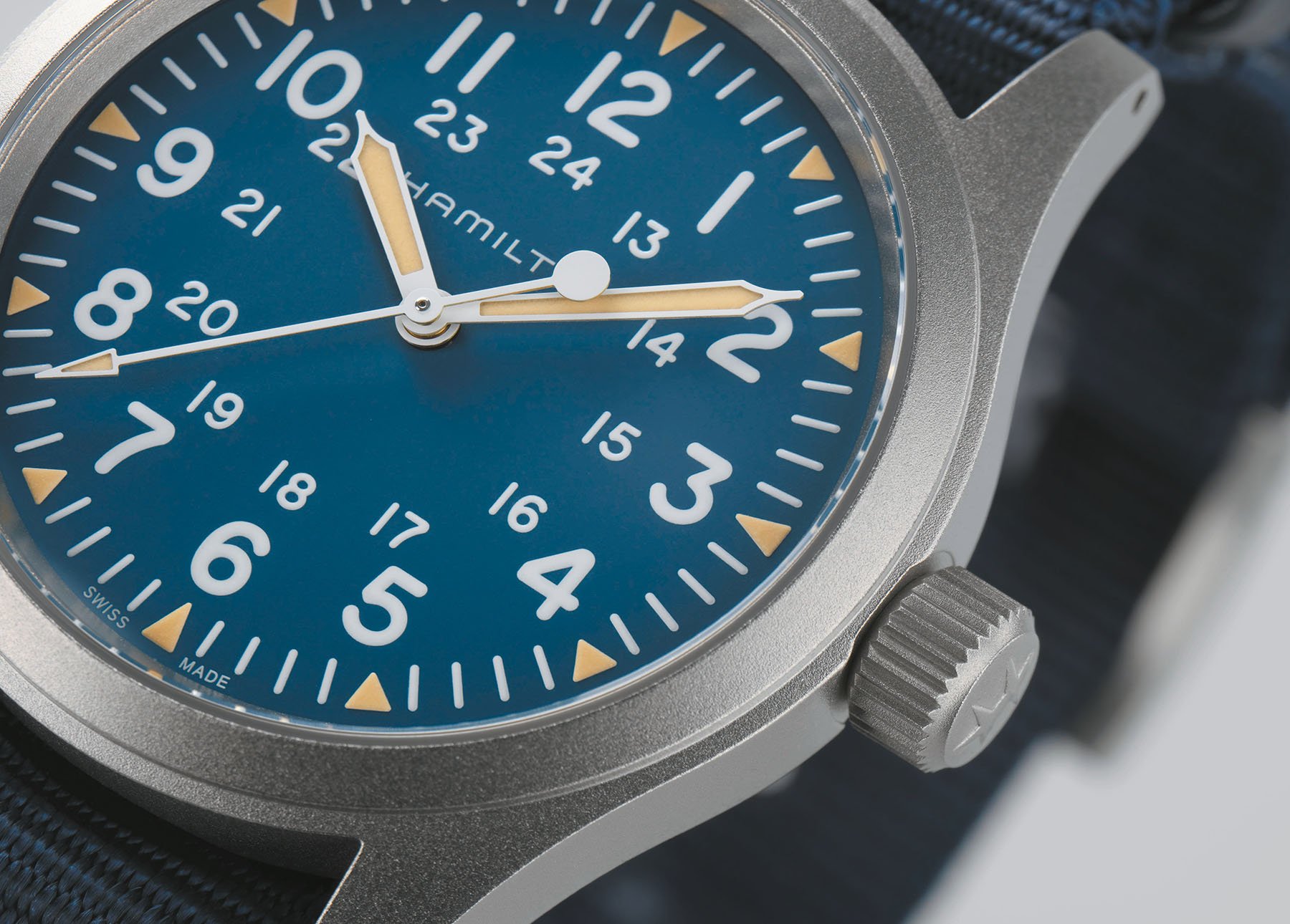 Inside the case, Hamilton uses the manual-winding H-50 movement. This is essentially a modern, upgraded version of the ETA 2801 with an 80-hour power reserve. In terms of different dial options, Hamilton added blue and white dials to its lineup last year. As Thomas explained in his review, the new white-dial version differs from the ones that were already in the collection and featured vintage-inspired and light green lume.