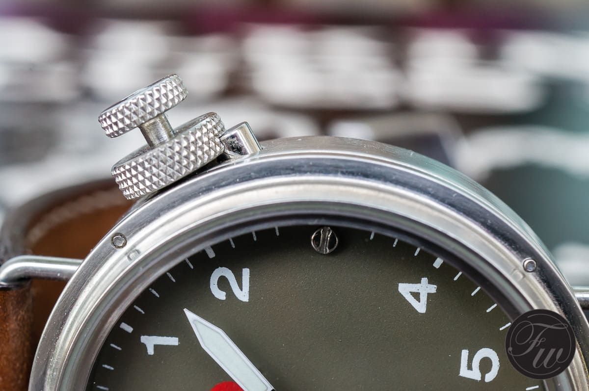Another quite unusual construction can be seen at the crown. A d.m.h. watch is equipped with an ingenious flange system which prevents the crown from being operated accidentally. The flange is secured by a spring pin which first has to be pushed-in before the flange can be turned. Only once the flange has been turned the crown can be operated in order to wind the automatic movement or to set the hands. A construction never seen on a watch before, invented, constructed and made by hand by Fred himself.