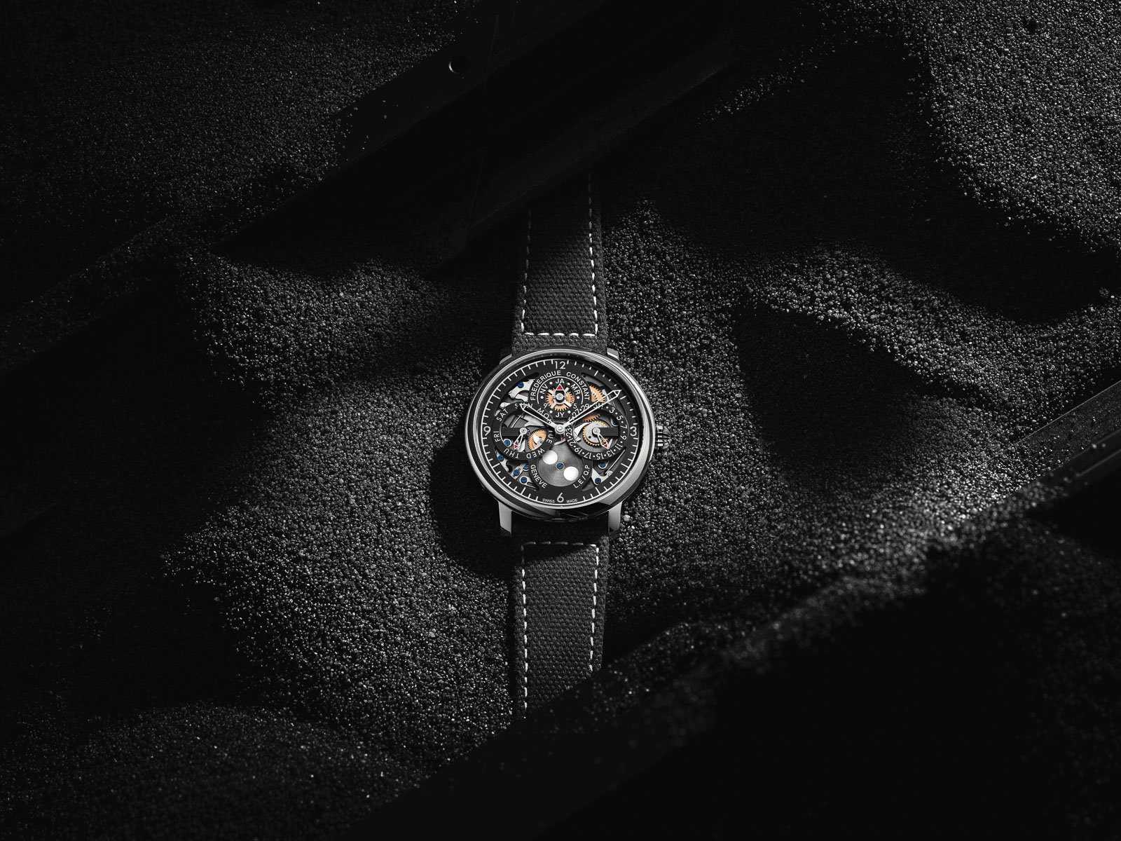 As a result of the dark dial colors, you get a great view of the movement. The elements that stand out immediately are the gold-colored gears and the blue screws. Other than that, it’s a pretty stealthy operation. The day and date sub-dials are noticeably bigger than both the month indicator and the moonphase display. Additionally, they are placed on top of them, bringing arguably the most important information to the front. A remarkable design choice is the deconstructed look of the moonphase indicator, which lacks the traditional overlay to help you see the lunar phases. As Thor explained when writing about the first model, the moonphase indicator was altered to be an animation reflecting the movement of time.