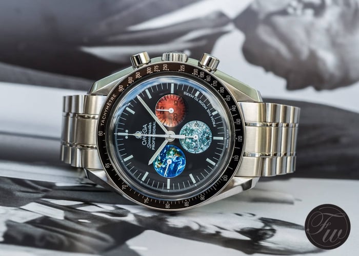 Interesting to note is that some of the Speedmaster From Moon to Mars editions out there, have different dials. This means, the dials are the same, but some show faded (or washed out) sub dials. Originally, and according to the original image from the press kit (see below), the planets on the dial are Earth (mainly blue), Moon (mainly grey) and Mars (mainly red).
