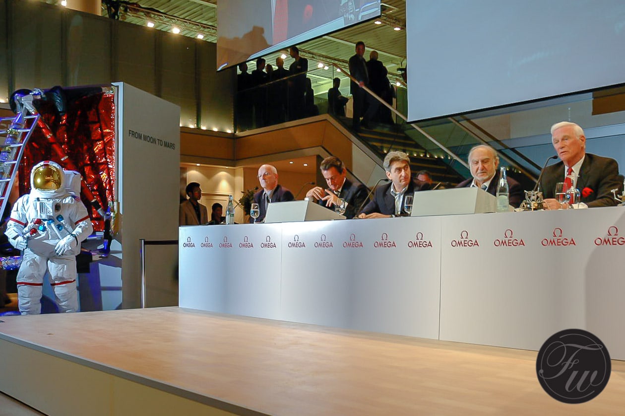 During the introduction, on April 17th 2004, 11:00 in the morning, there was a special press conference with astronaut Gene Cernan (on the far right), Stephen Urquhart (2nd one from left, then CEO of Omega), Nick Hayek (center), Nicolas Hayek (2nd one from right). We can’t recall who is on the far left of the photo below, so if you know this, please let us know.