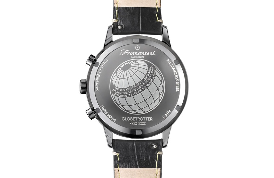 The Globetrotter Series watches celebrate the multinational endeavors of Ahasuerus and his sons, who owned shops and workplaces in both England and the Netherlands. That’s why there’s a globe engraved on the back.