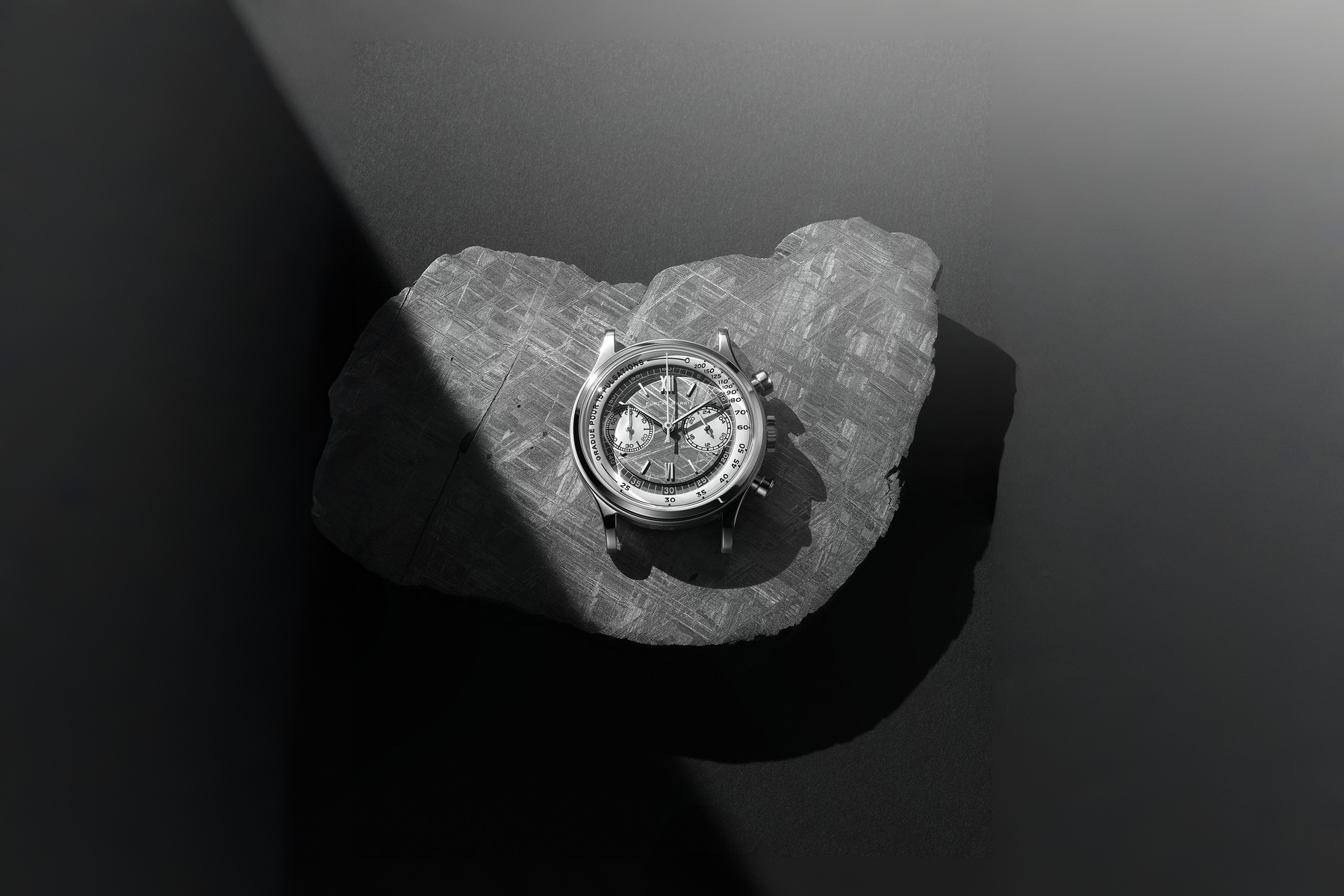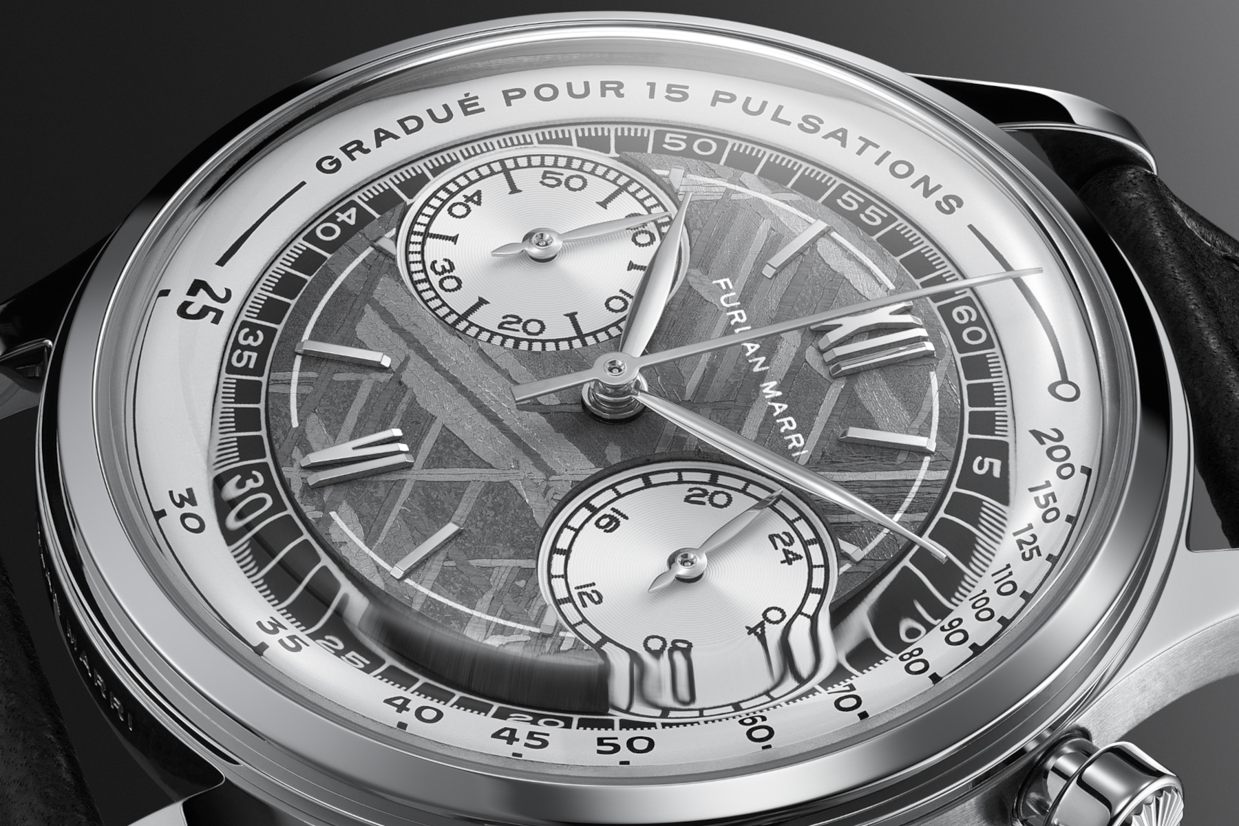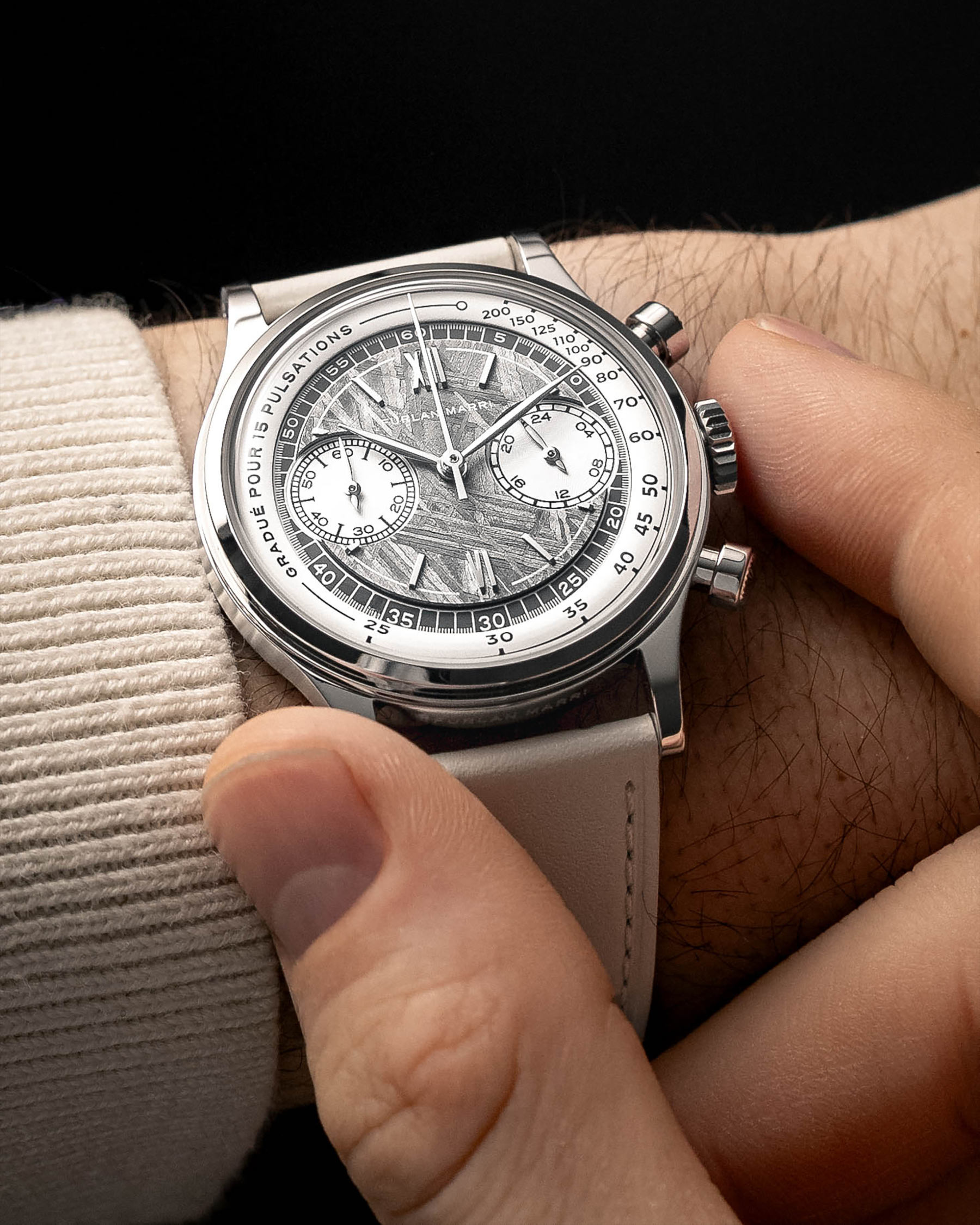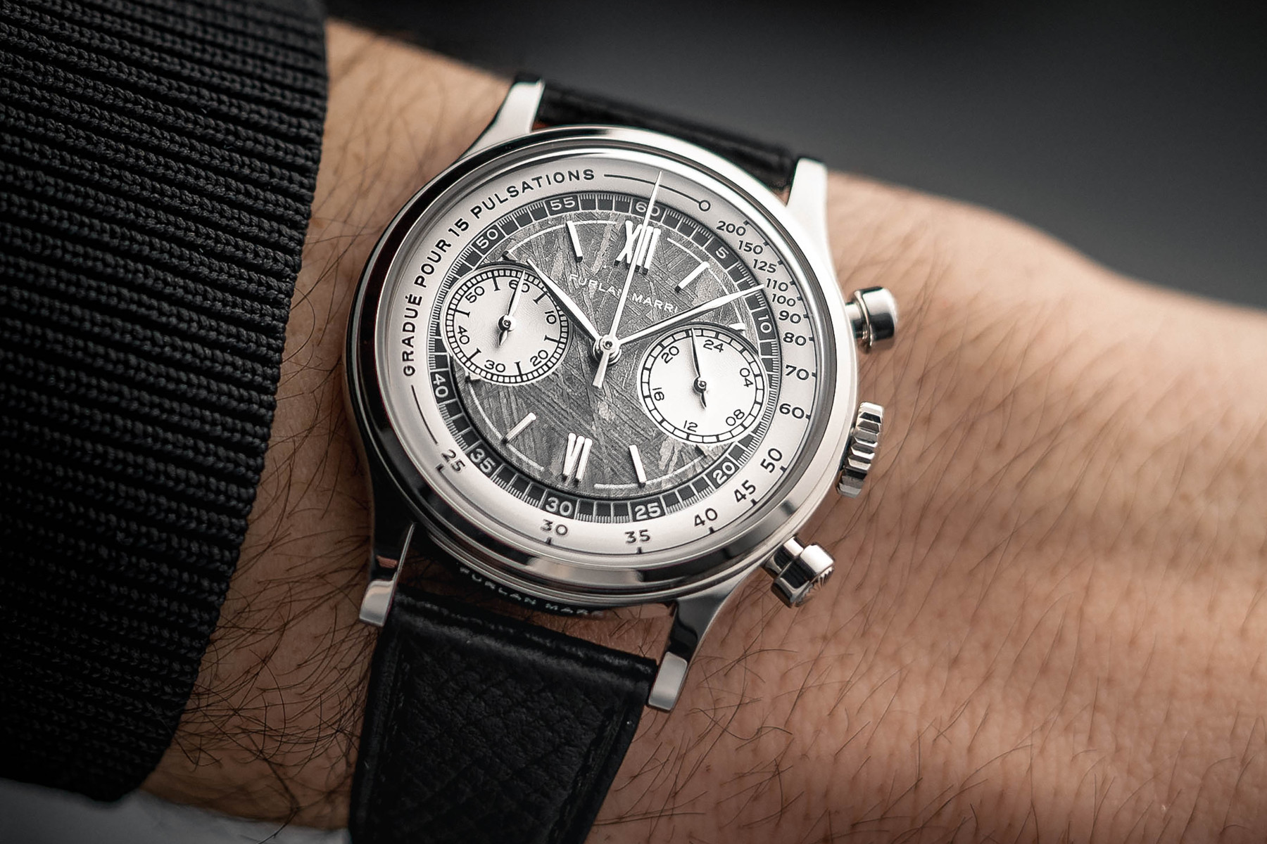 The watch confidently embraces its influences. It leans hard into the design blueprint of a traditional chronograph. The addition of a meteorite dial could feel kitsch, especially as stone and meteorite are trendy in horology. Instead, the detail is grounded by the restraint and simplicity of the design. The Meteorite Octa is part of Furlan Marri’s Mechaquartz collection. This line draws inspiration from François Borgel, a key early 20th-century case maker. Refined details, like the engraved “Tasti Tondi” pushers from vintage ’40s and ’50s chronographs, cement the influence. The overall design also aims for a cosmic feel.
