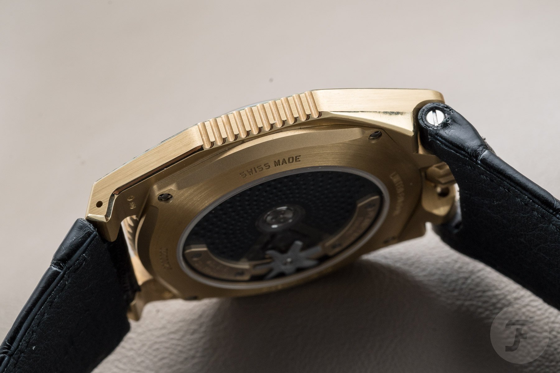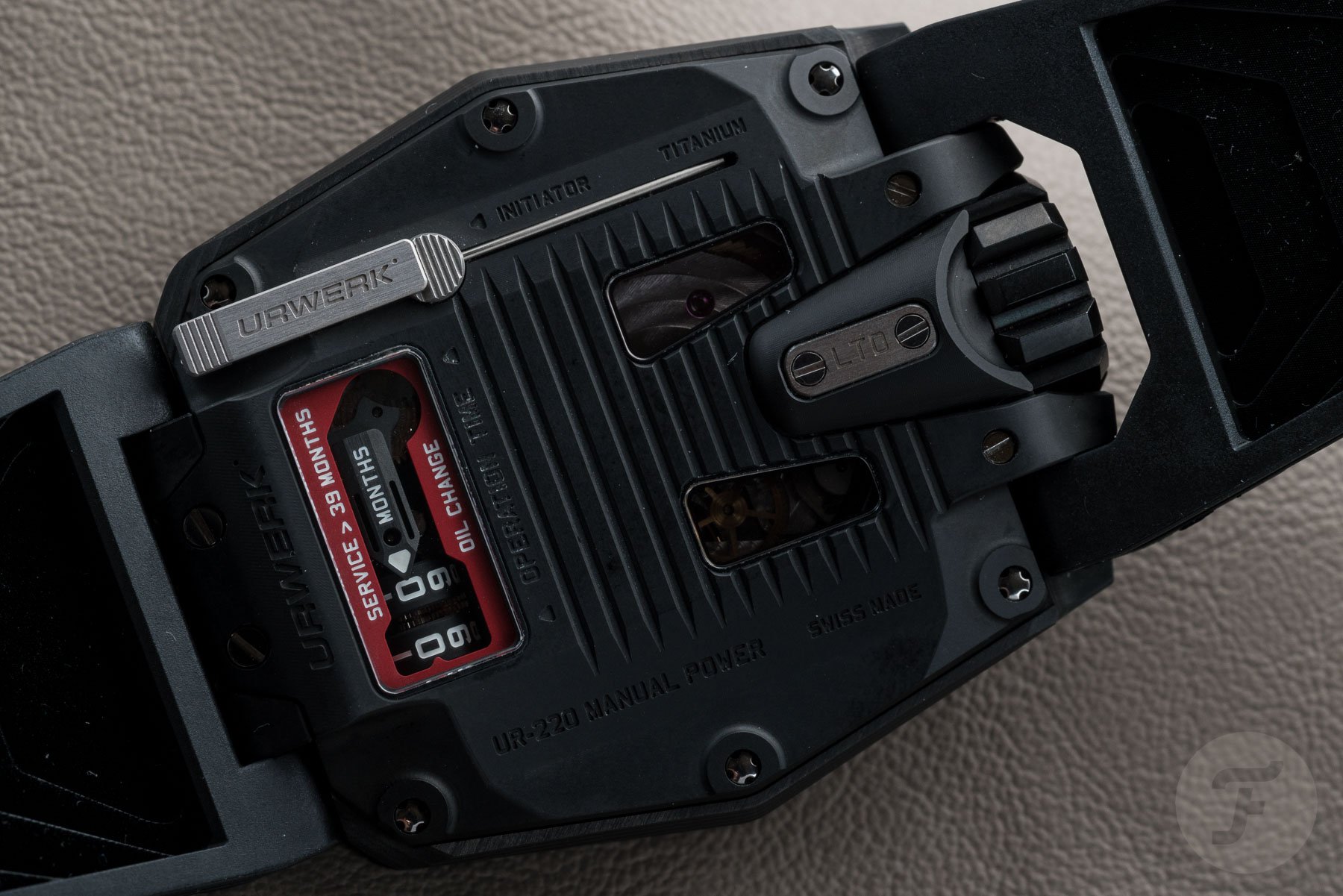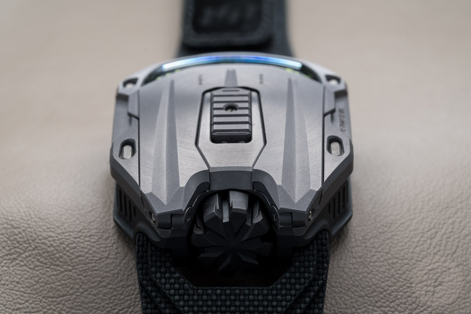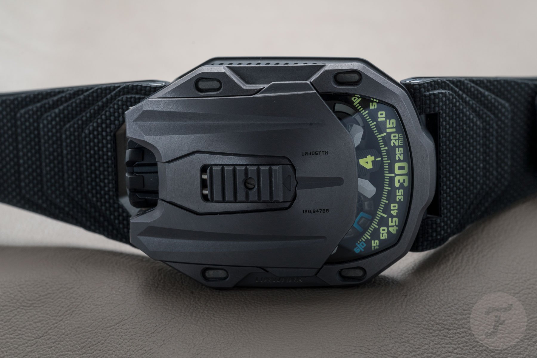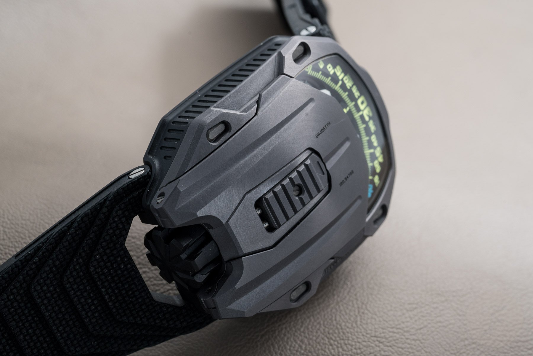We briefly mentioned the strap of this watch in our Geneva Watch Days Live article. One of the odder things about this watch (and the thing stealing the majority of our attention) was the rubber strap. It’s vulcanized, but the tail end of it and a small square on the 12 o’clock side has been “pricked” with a very fine needle. The result is a soft-touch surface akin to suede. It is thoroughly bizarre, but lovely to rub between one’s fingers. This kind of strap was solely for the UR-220 series save for this UR-105 Tantalum Hull. Simply superb!