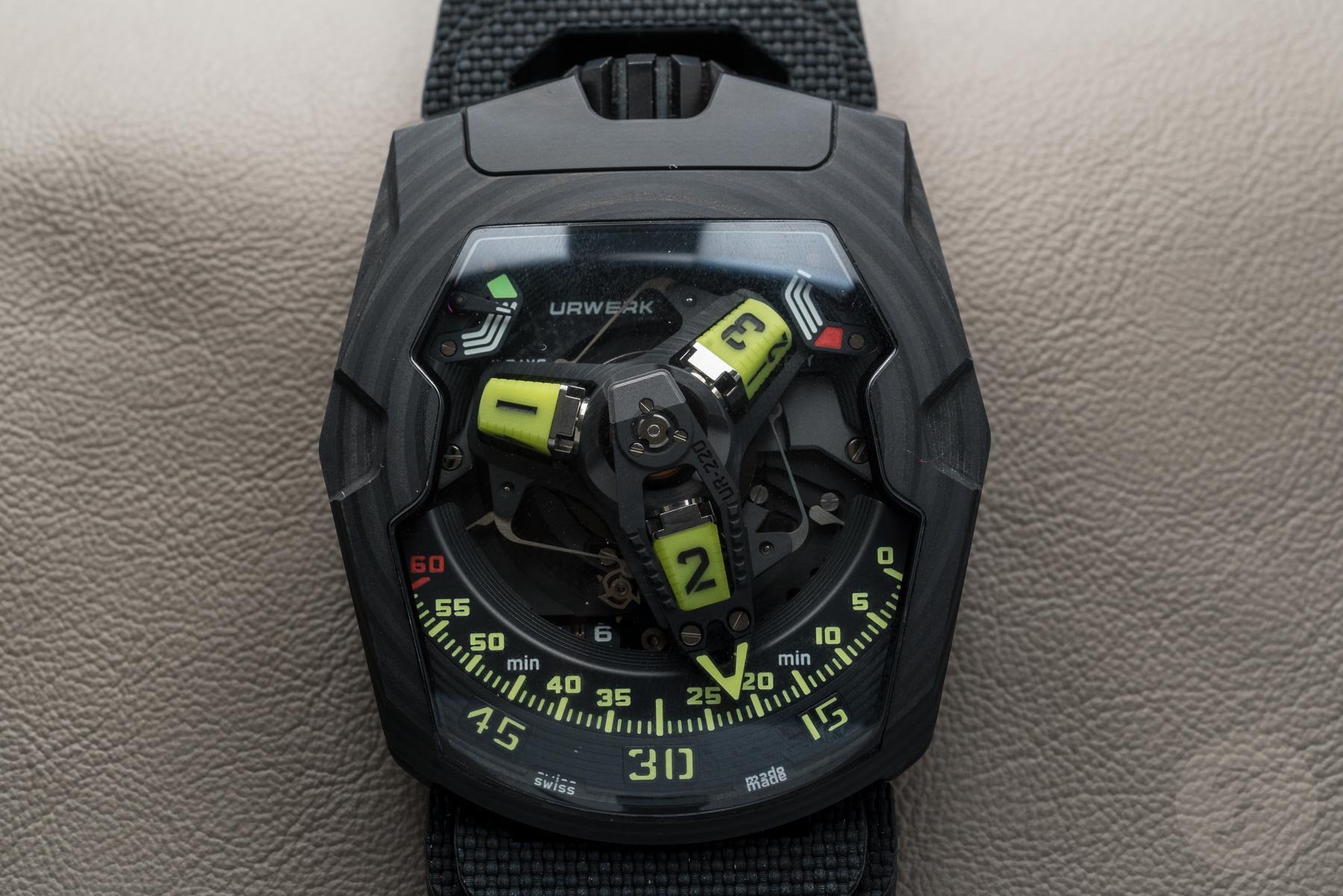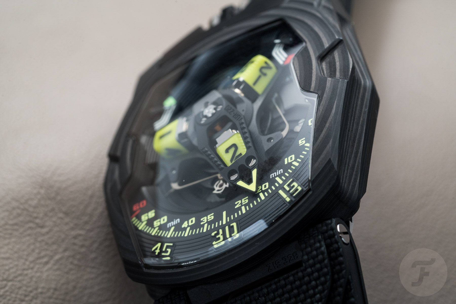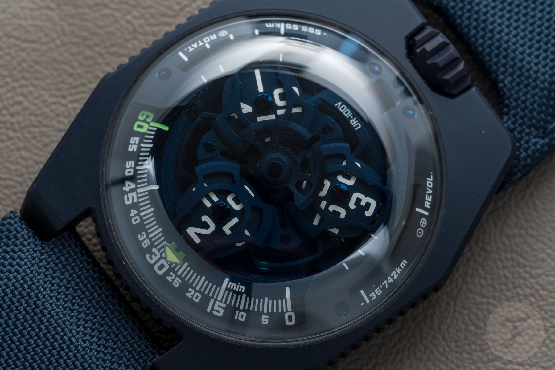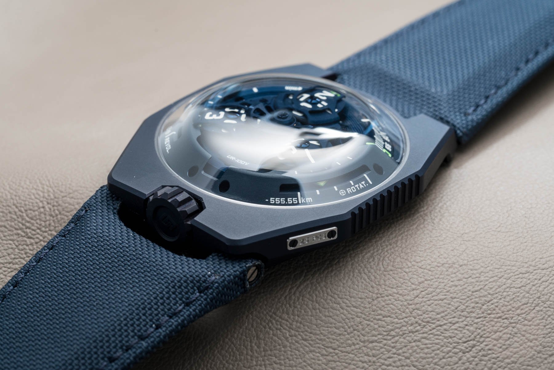 On previous versions of the UR-220, the hour blocks were CNC machined, and then the numerals were infilled with lume. The new solid Super-LumiNova hour blocks look fantastic though — even in daylight! It’s pretty obvious, though, where this watch comes into its own. Thankfully the Urwerk team had a UV torch on hand. We could charge them up before sticking our heads in a dark cupboard to allow the Asimov to really come to life. I stand by my adoration from my previous hot take; I’m glad to report it didn’t fail to impress up close.