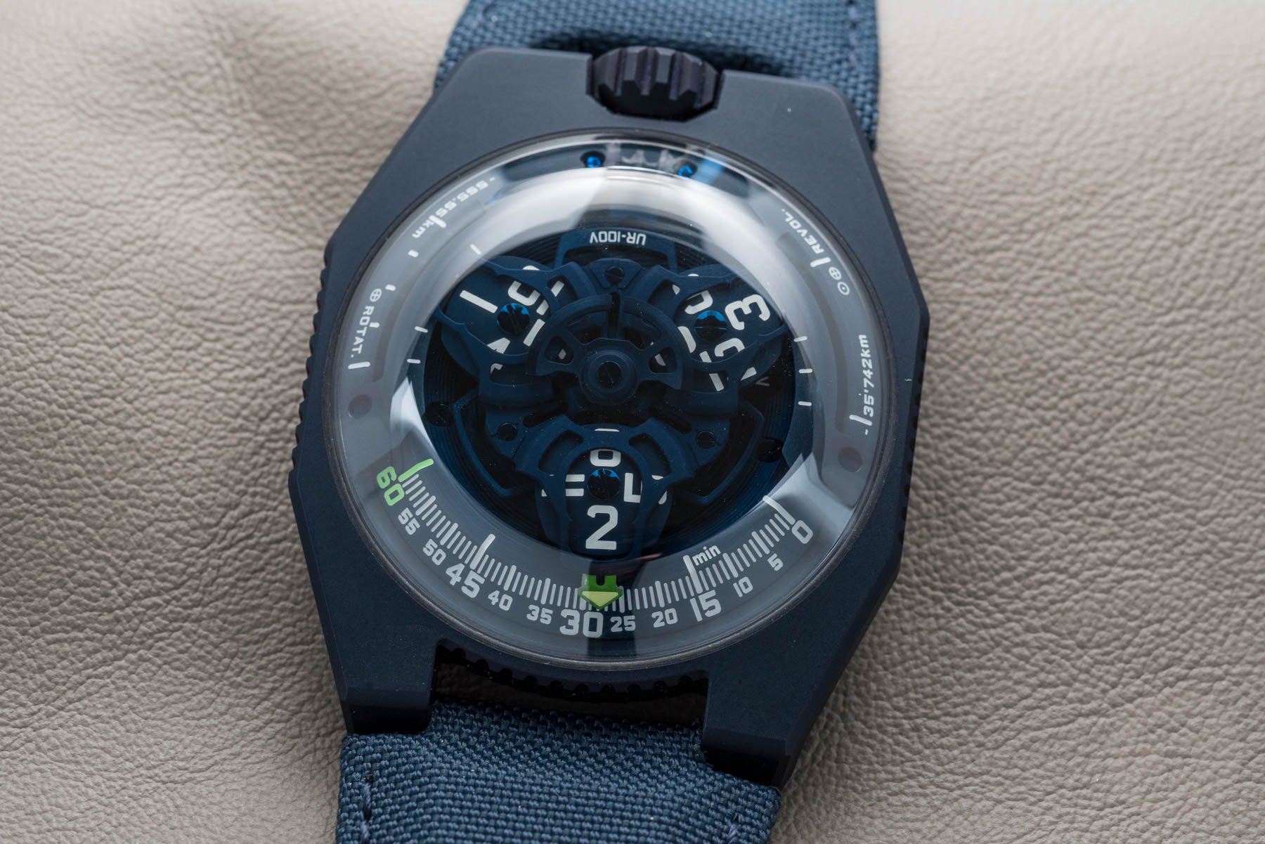 I saw this one on the wrist of Urwerk’s Marketing Manager, Pierre. Having now seen it in hand, I can finally see quite how much of a full-on blue “assault” the UR-100 Blue Planet really was. I whole-hearted mean that in a positive way. If something is worth doing, it’s worth doing properly. For that reason, it’s always nice to a see a brand taking a concept and embracing it fully.