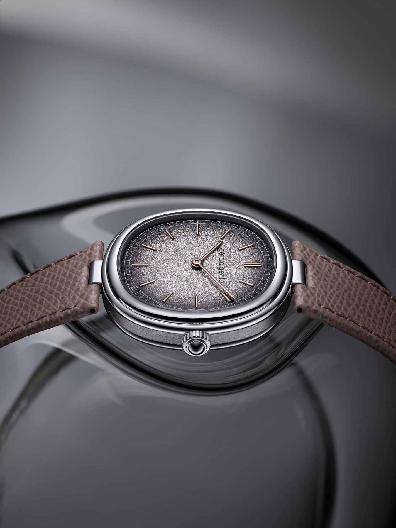 So, how do you like your dial — brown or gray? The colors differ, but the rest is the same. Both Geneva Time Only watches feature a grained dial with a smoked gradient effect, a two-tier minute track, 4N rose gold indexes, and rounded, polished hands with pointed tips.