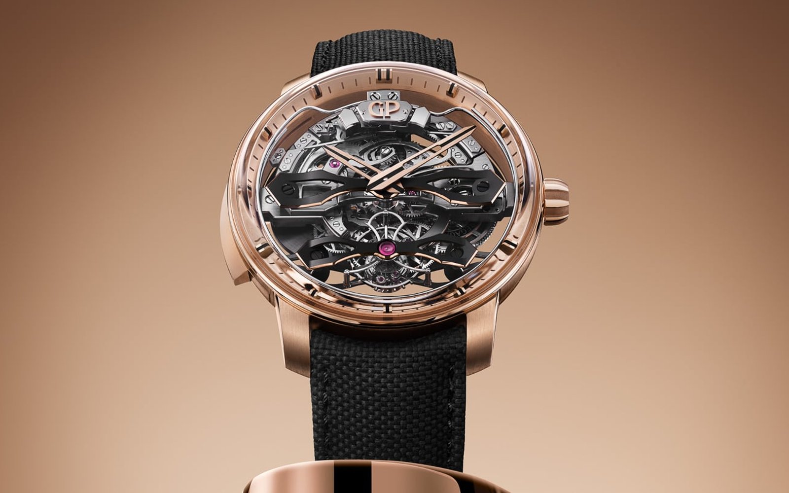 For this caliber, two titanium bridges are visible on the front, while the last is on the reverse, anchoring the tourbillon. If we return to the front of the movement, we find it surrounded by white metal gongs. Twin hammers lie on either side of the GP logo. Specific design choices were made to improve the sound of the complication. These include attaching the titanium mainplate directly to the gold case and using similar sapphire crystals on both sides.
