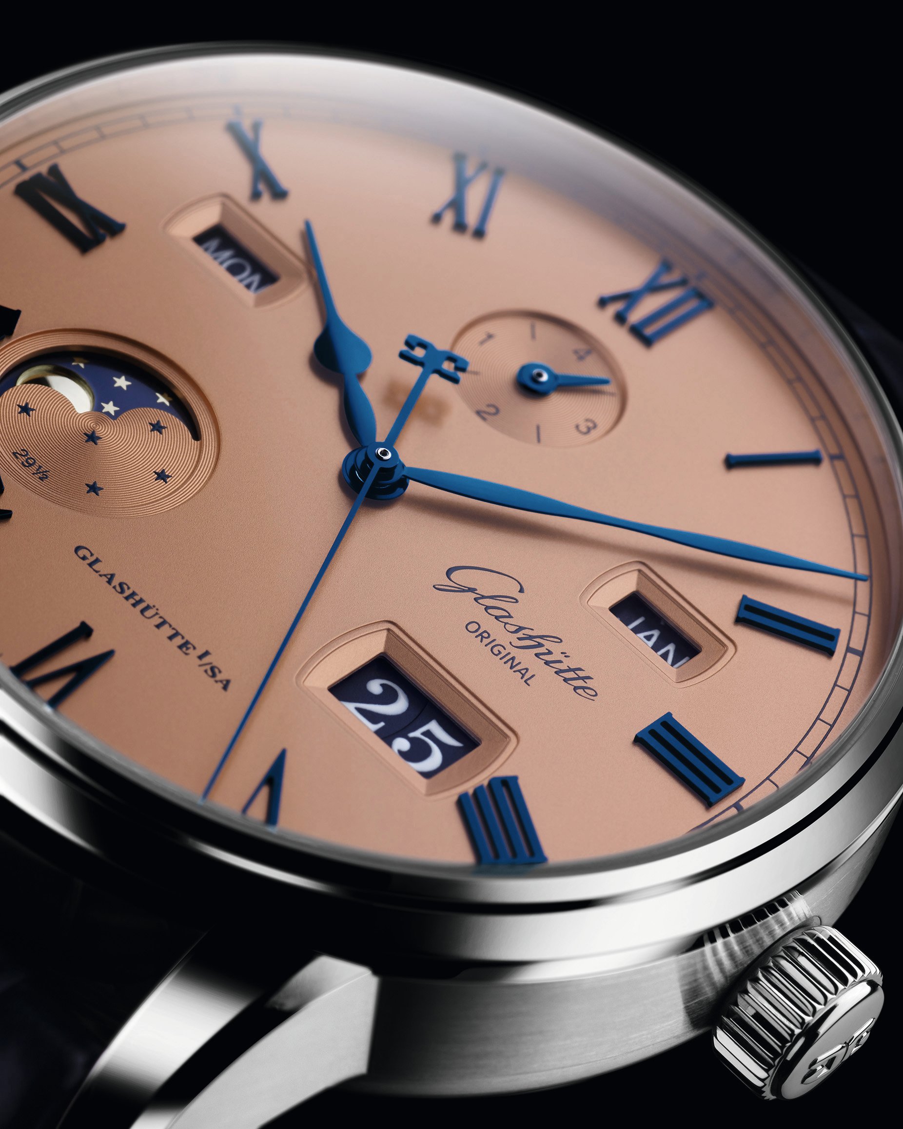 The well-known dial manufacture of Glashütte Original has performed flawlessly with the chameleon-like galvanic coloring of the dial ensuring a mix of flash and function. Silky-grained luscious in the right light, my favorite here as a dial-a-holic. The moon phase at 7:30 is recessed with a step, 5 gold stars, and a rich blue night sky revealing a pop of gold in the moon. This keeps the balance juxtaposed with the big panorama date window, its twin discs ensuring legibility, and surely silencing any date window-naysayers out there. As if written by the watchmaker with a sharp quill, the logo sits offset in blue at 3, and for some reason it all gels. The bottom half of the dial is asymmetrical as anything, but the larger moon phase gets its match in the deep blue date window and logo, in a quirky wrong-but-right vision of copper pink.