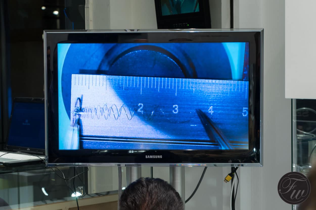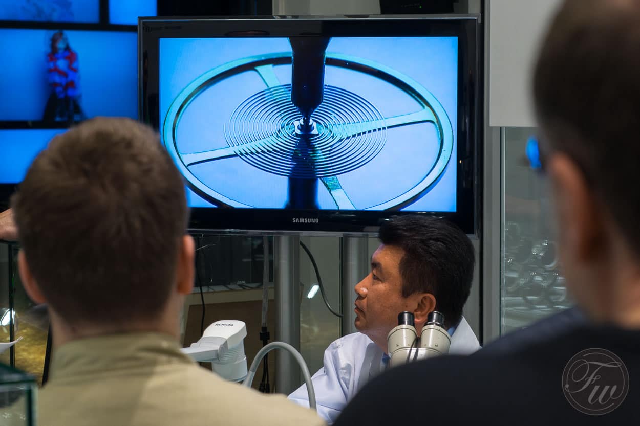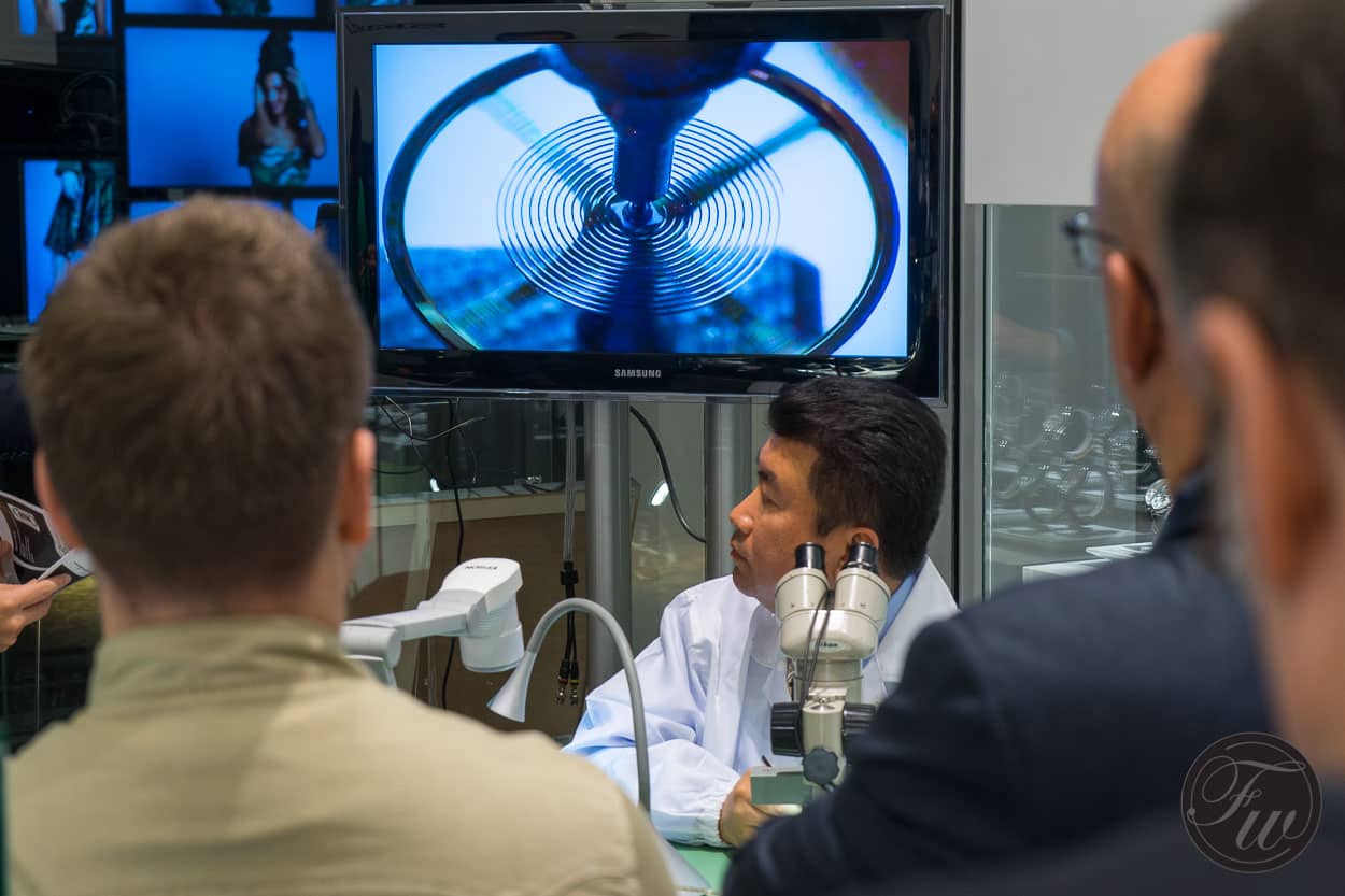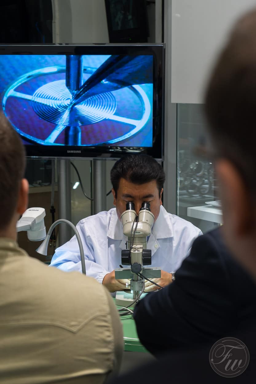 Stretching a hair spring to show the properties of Seiko’s own SPRON material (anti-magnetic and super strong)