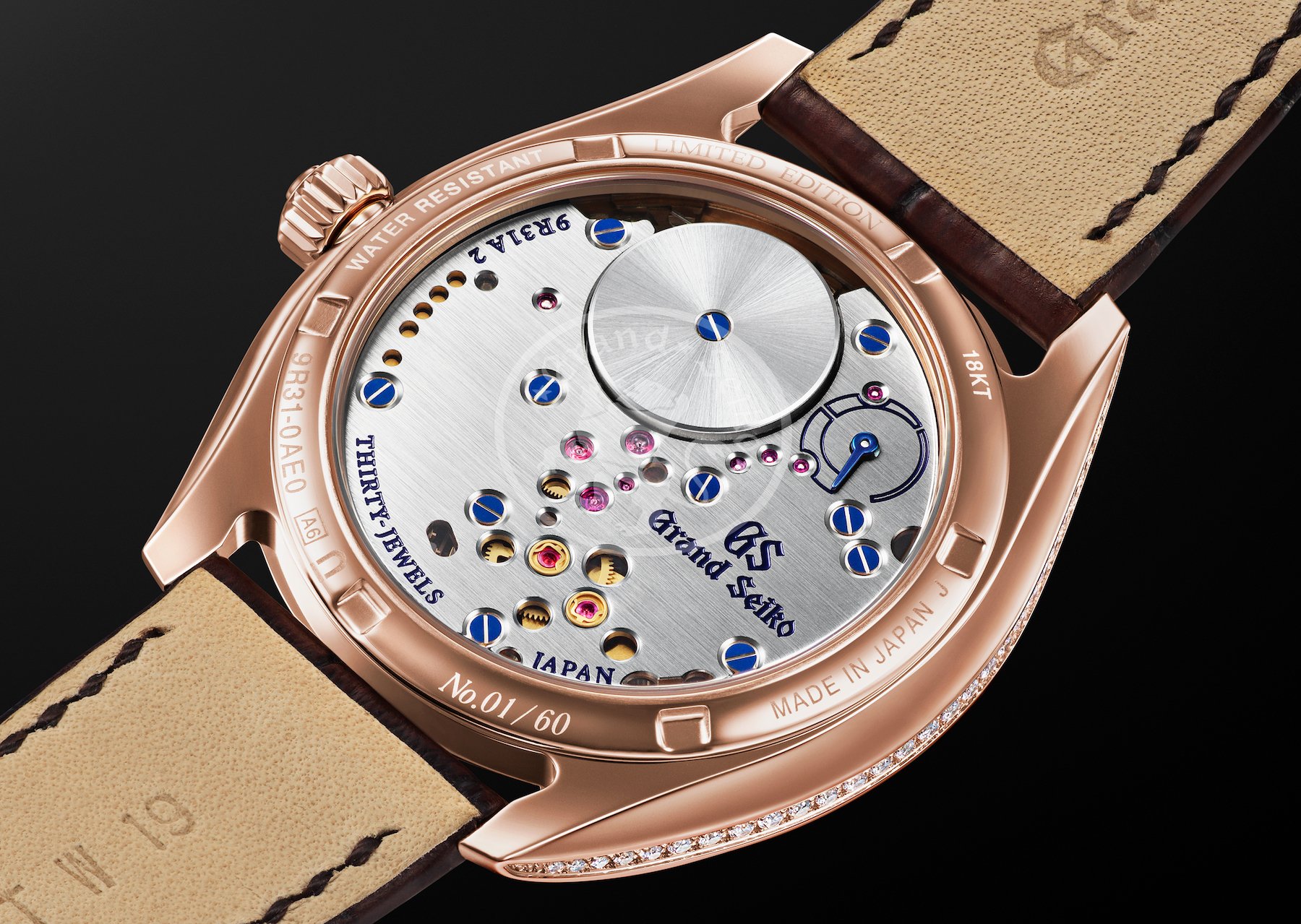 Bestowing a sense of calm upon the dial is the gliding motion of the constantly moving rose gold second hand, courtesy of the Spring Drive Calibre 9R31. Unlike a standard quartz movement, it goes without a battery and is powered by mechanical energy stored in the movement’s twin barrels. Surpassing COSC standards, the movement is said by Grand Seiko to promise an accuracy rating of +/- 1 second per day. This hand-wound proprietary Spring Drive technology is capable of a 72-hour power reserve and features a power reserve indicator on its reverse, viewable through a sapphire-backed case. It’s here that you’ll also see the tempered blued screws, beautifully finished bridges, and many other perfectly engineered components to the Calibre 9R31 as it performs.