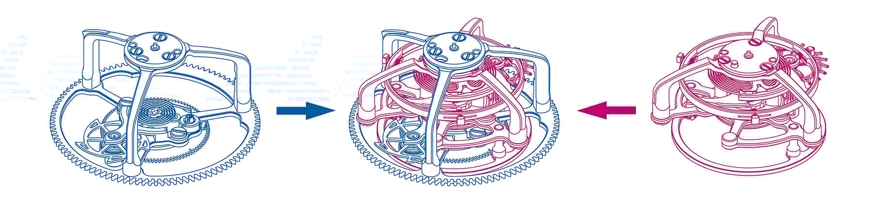 The result is an impressive pairing of mechanisms that sits on the same axis and, therefore, loses no torque between them. The hand-winding movement has a power reserve of 50 hours and an accuracy of +5/-3 seconds per day.