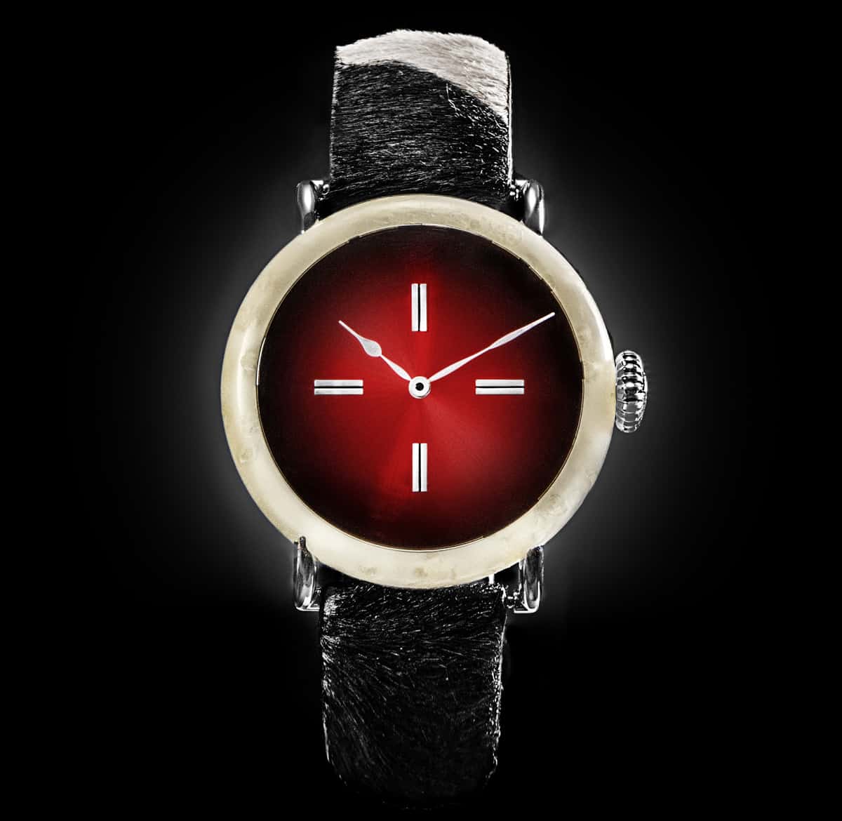 Created in Switzerland, by Swiss watchmakers and using Swiss materials: the Swiss Mad Watch has symbolic value, tackling Swiss Made debate head on to reveal the truth behind this label. With this unique watch, H. Moser & Cie. demonstrates the importance and urgency of returning Swiss Made to its former heights. Echoing the absurdity and the ridiculous change to the Swiss Made legislation, H. Moser & Cie.’s satirical comment on the issue highlights an alternative resource, 100% natural and entirely Swiss, one of the most precious Swiss resources that exists: cows. The case of the Swiss Mad Watch is created from real Swiss cheese as a base material, a Vacherin Mont d’Or médaille d’or, added to an innovative composite material, itr2©, then machined and polished with the H. Moser signature finishes. For the strap, Swiss cowhide was the obvious choice. The watch is finished with a red fumé dial and doubled indices at 12, 3, 6 and 9 o’clock, subtly reminiscent of the Swiss flag. The result?