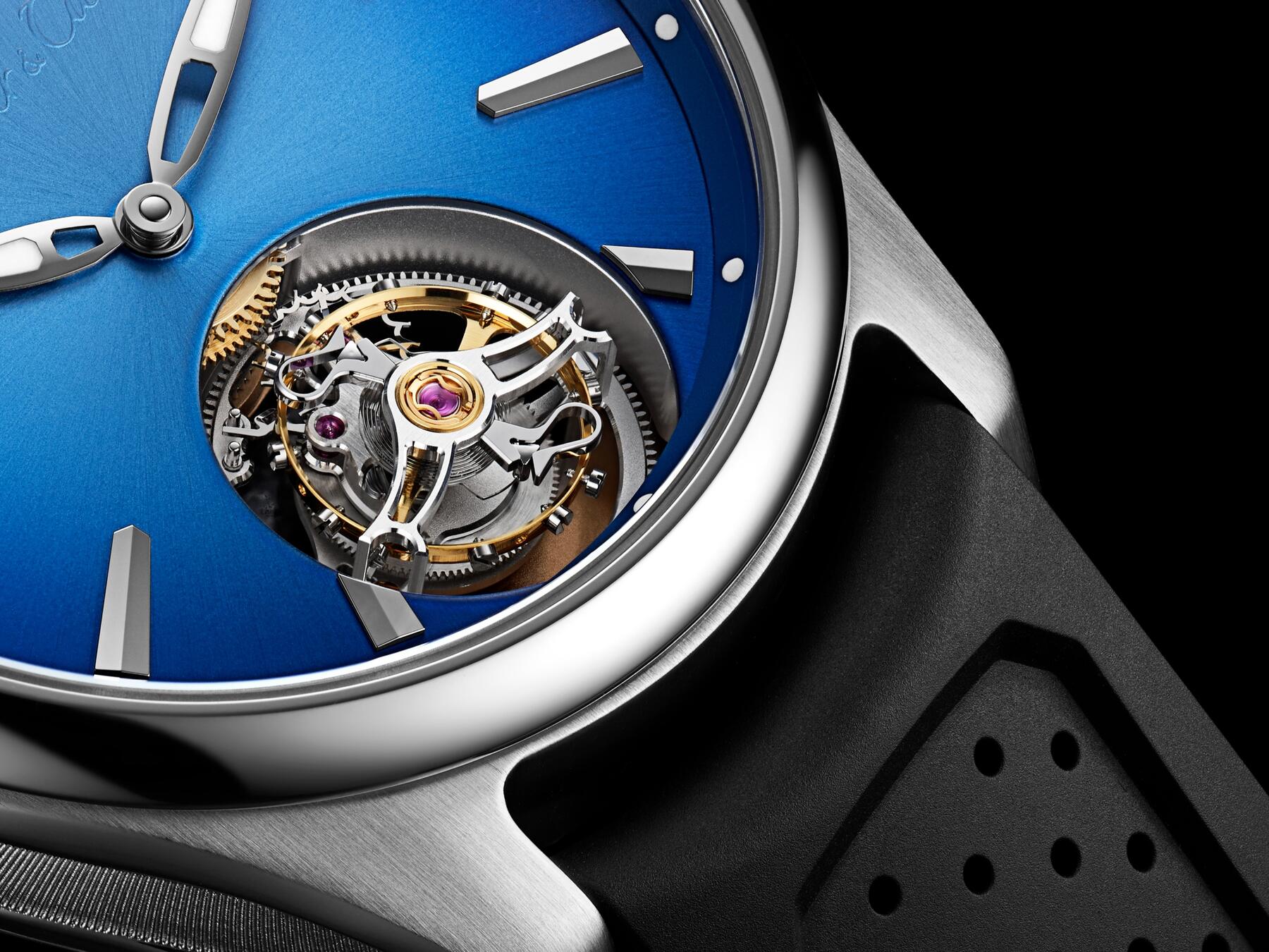 Have you spotted the ghostly logo? Look again, and you’ll see the sweeping font of the “H. Moser & Cie.” script in clear lacquer print on the dial. Despite the lack of in-your-face branding, the 40mm Pioneer is pure H. Moser. Even viewed against the alien cool of the Streamliner or mad MB&F collabs, there is a cohesive language of cool. Now, US$54,900 is not great value for a time-only sports watch. But what if you add a tourbillon to the mix? If memory serves me right, that’s a rather good price. The 40mm Pioneer Tourbillon Arctic Blue is as jaw-dropping as any rich-dialed Moser can be, but with the added flex power of a flying tourbillon. It also retains the 10.4mm case thickness and the three-day power reserve of the Centre Seconds.