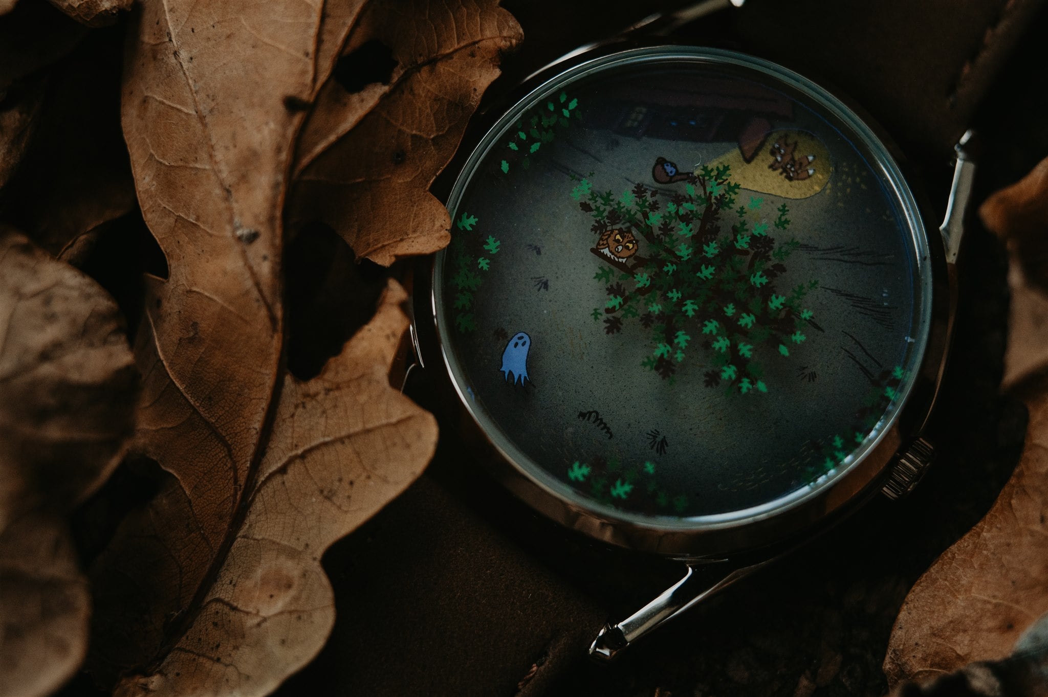 The cheeky creators of distinctive wristwear at Mr Jones Watches in London never disappoint when October comes along. This year, their inaugural Halloween release, the Night Howl, has been designed by French author and illustrator Xavier Broche. It will be part of the regular collection and features their trademark cool display concept. In an eerily dark forest, a character most likely representing the wearer wields a flashlight to indicate the minutes. This rotates, slowly revealing a fox and her cub, an owl, and just maybe a scary ghost… The owl within the dark tree canopy represents the hours, all set within a very comfortably wearing skeleton-lugged polished 37 × 46.9 × 10.8mm case. With this cheerful Halloween piece powered by a solid Swiss quartz movement, I don’t think you can go wrong for £225.
