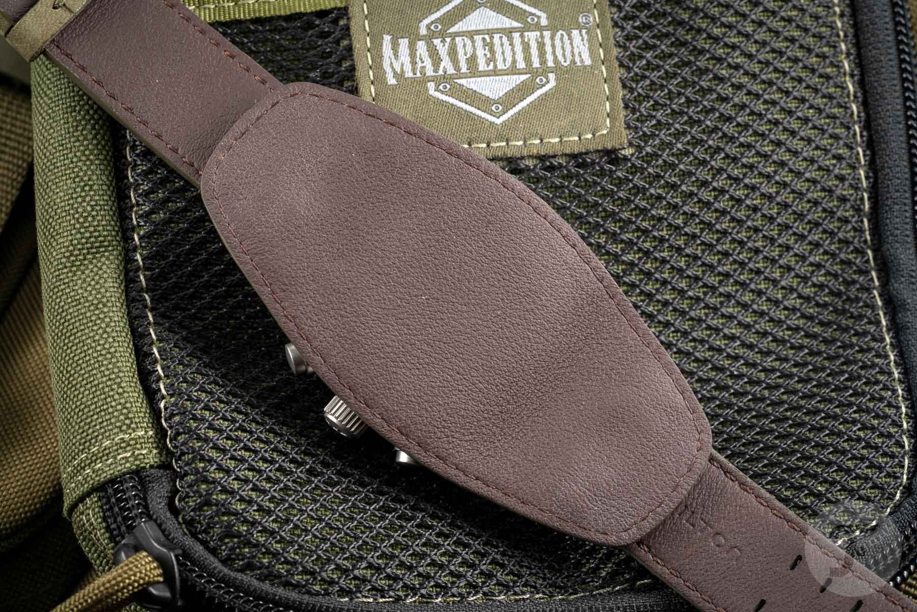 The watch’s case is 44 × 52 millimeters of sleek bead-blasted steel. Standing tall at 14.2mm thick, this is a watch with plenty of wrist presence without going over-the-top in terms of thickness. The bund strap boosts this dimension to 16.5mm. Meaning that, should you want to take off the pad, the watch would gain in terms of how streamlined it sits on the wrist. The pushers are extremely satisfying to operate, starting, stopping, and resetting the chronograph with a hearty satisfying click. The crown is large and grippy, making it a joy to set the time. Once you’ve set the time, you’ll be happy to screw it back into the case, restoring the 100m water-resistance of this watch. This is a watch ready for anything you might throw at it.