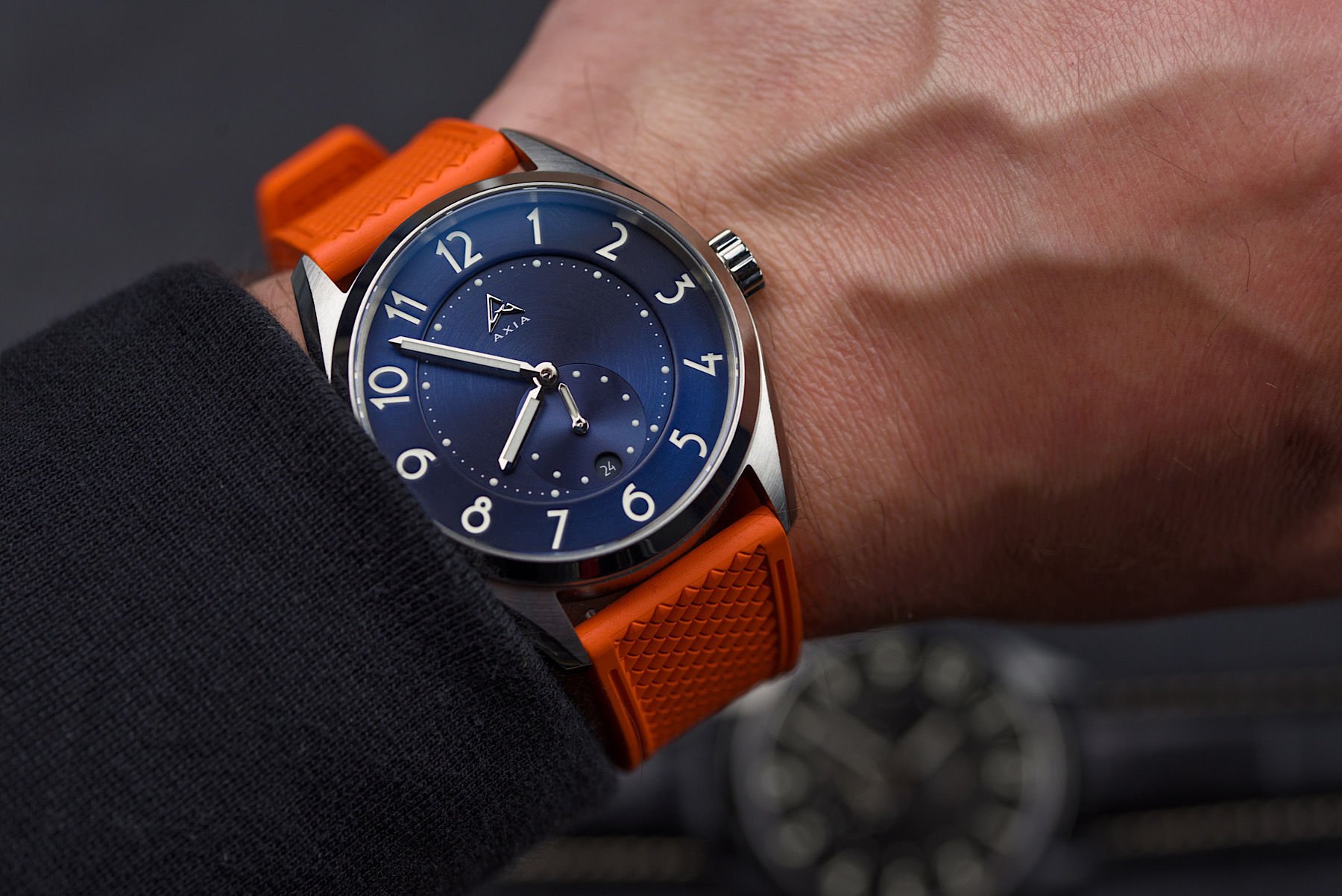 As standard, the watch comes fitted with a genuine alligator strap, which plays to the formal aspects of the watch and polished case surfaces. However, the 22mm lug spacing is wider than you might expect given the watch’s diameter. Such a ratio typically points towards a sportier look and feel. Axia Time also sent over an orange rubber strap. While not included in the package, it feels a better match for the overall aesthetic and is how I would choose to wear this piece.