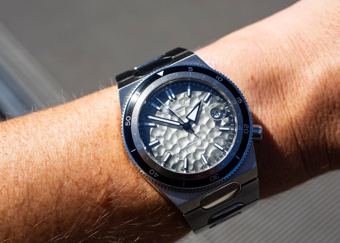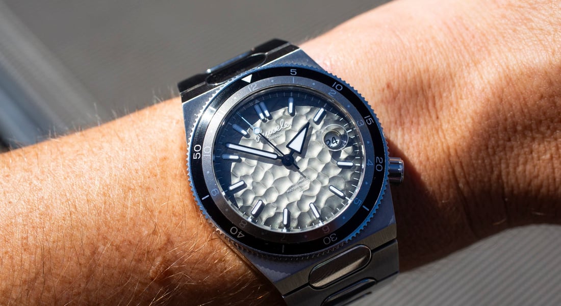 Now, I must admit I wasn’t first drawn to the overall design of the Elemental; it’s rather bold. Over time, though, I grew to appreciate it more and more. The different elements, whether it’s the sandy look of the textured dial that creates a beautiful wave pattern under sunlight, the two colors on the bezel, or the unusual handset design, don’t compete with each other. Overall, we have a watch design that is reasonably original and not too derivative, which is no small feat in the integrated-bracelet category.