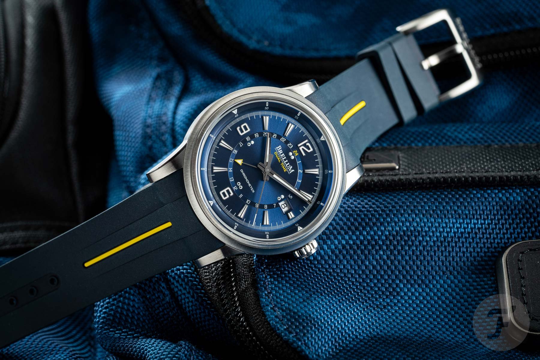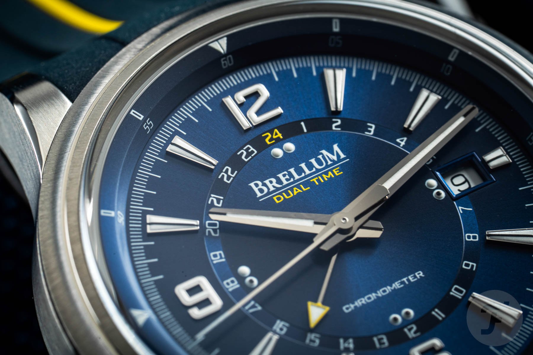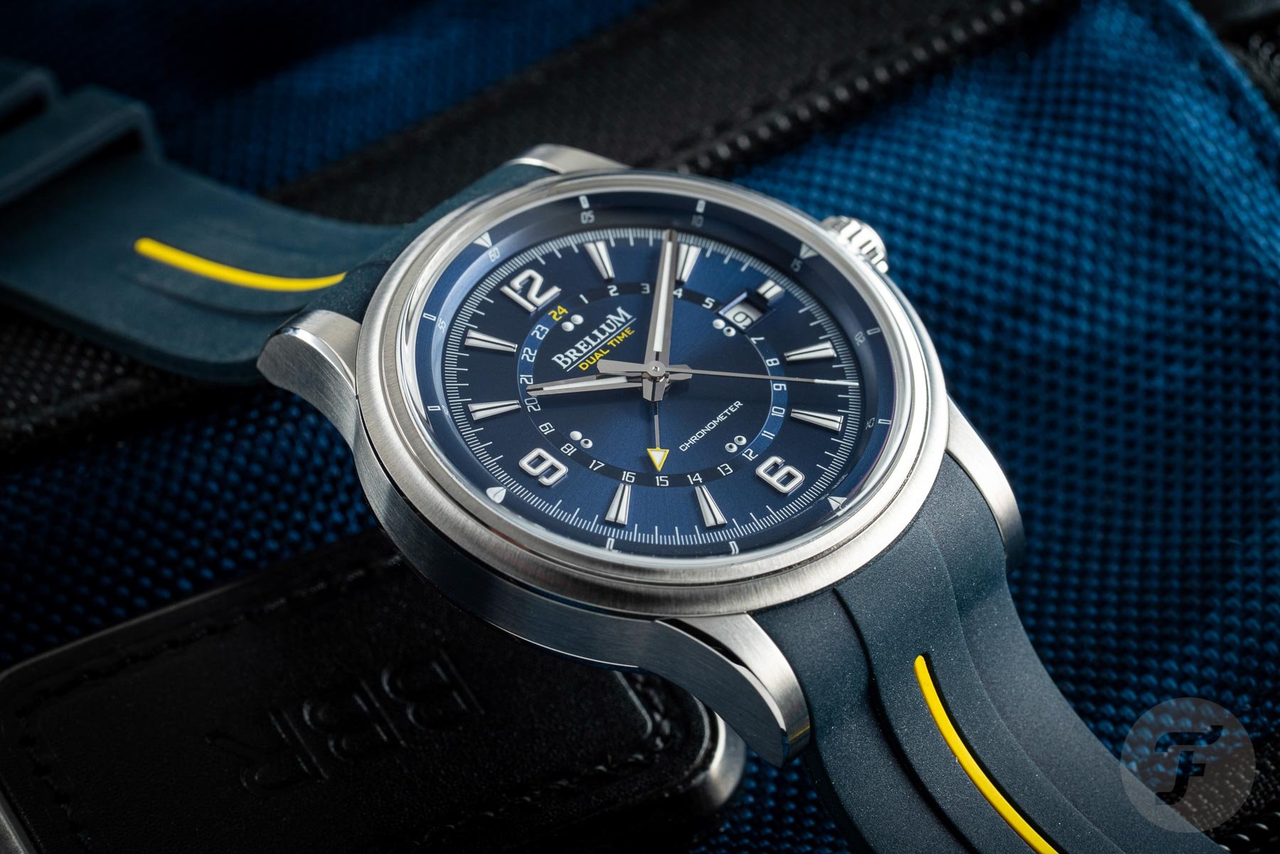 The underlined brand name sits at the 12 o’clock position, with the words “dual time” printed below it in yellow. This color detail matches the arrow tip of the GMT hand. It also matches the 24 on the second timezone display and a line on the rubber strap. At 6 o’clock, the word “chronometer” reveals the movement’s impressive achievement. The overall look and structure of the dial might remind you of the JLC Polaris. And this is not a bad thing, as the Polaris is an undeniably handsome watch. One final thing to point out is that I was not a huge fan of the day/night indication at first. Though it’s conveniently lumed, I couldn’t help but feel like I was being looked at by a pair of googly eyes just above the 6 o’clock position. However, I quickly got used to it and embraced the quirky look.