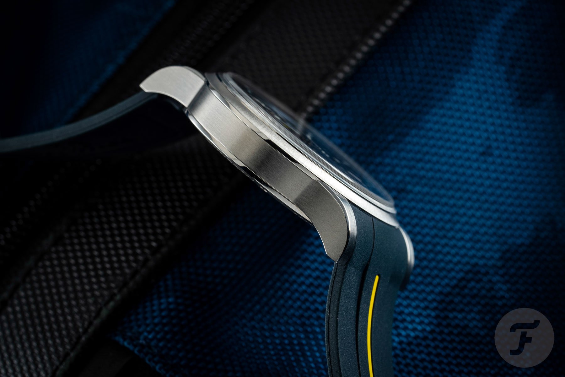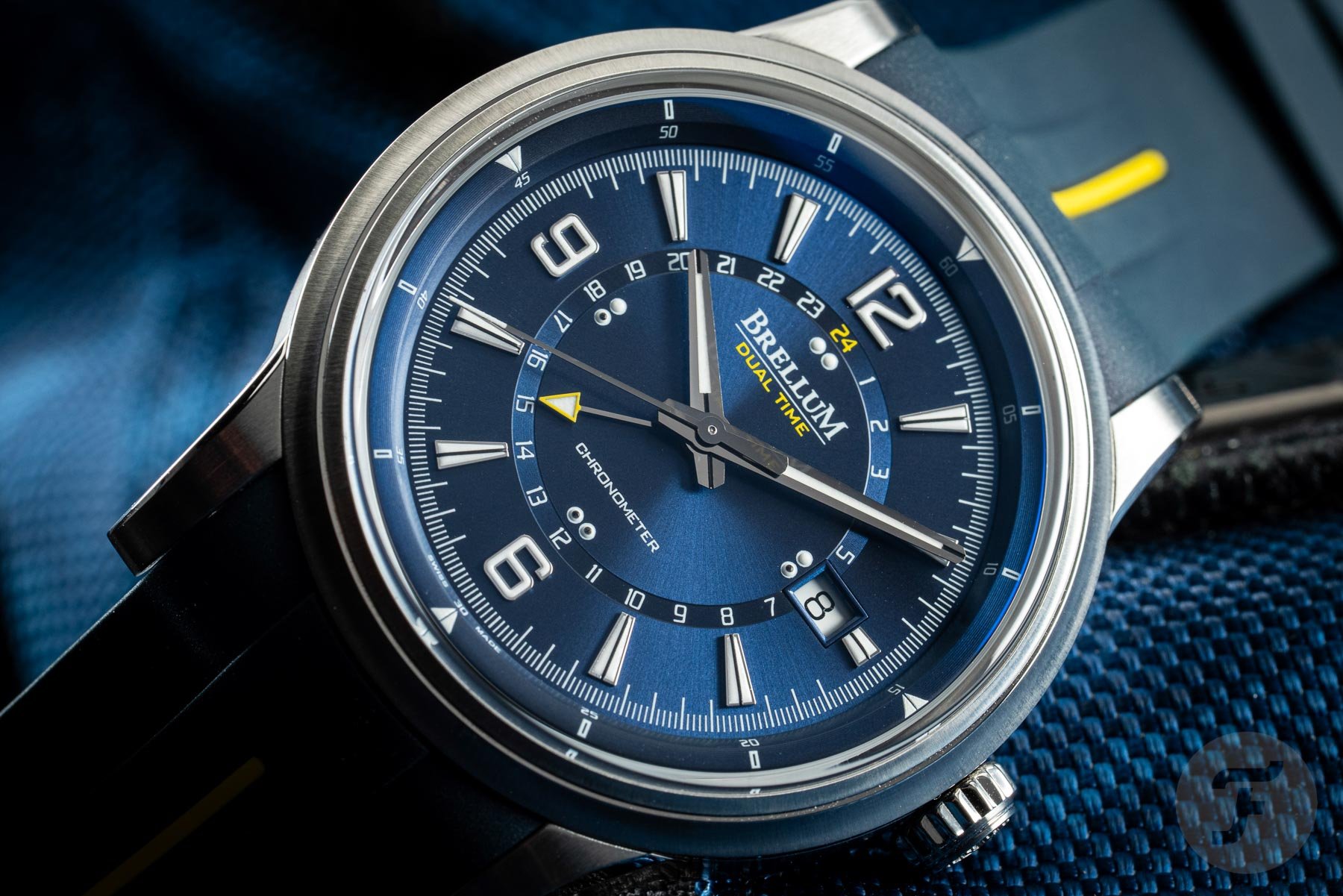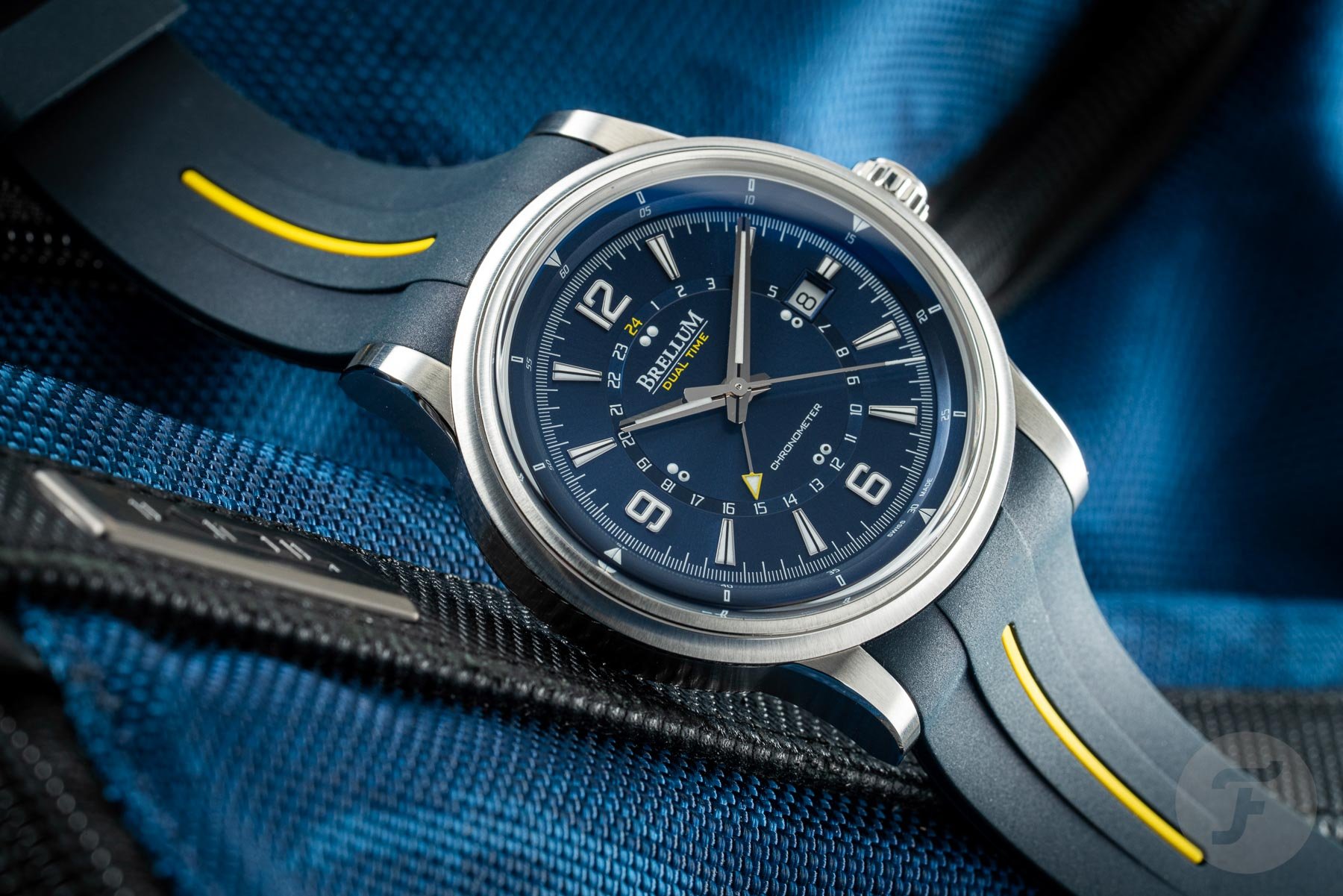 The underlined brand name sits at the 12 o’clock position, with the words “dual time” printed below it in yellow. This color detail matches the arrow tip of the GMT hand. It also matches the 24 on the second timezone display and a line on the rubber strap. At 6 o’clock, the word “chronometer” reveals the movement’s impressive achievement. The overall look and structure of the dial might remind you of the JLC Polaris. And this is not a bad thing, as the Polaris is an undeniably handsome watch. One final thing to point out is that I was not a huge fan of the day/night indication at first. Though it’s conveniently lumed, I couldn’t help but feel like I was being looked at by a pair of googly eyes just above the 6 o’clock position. However, I quickly got used to it and embraced the quirky look.