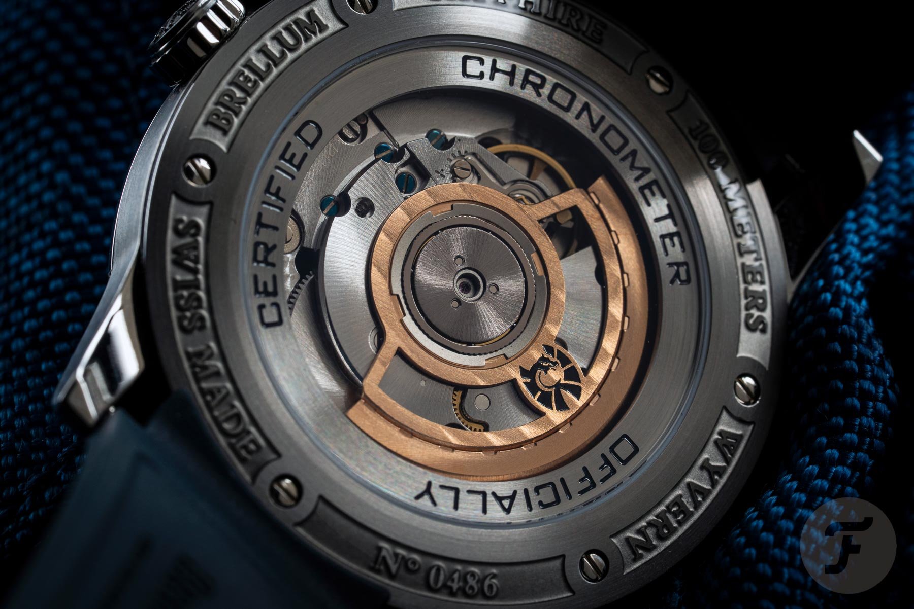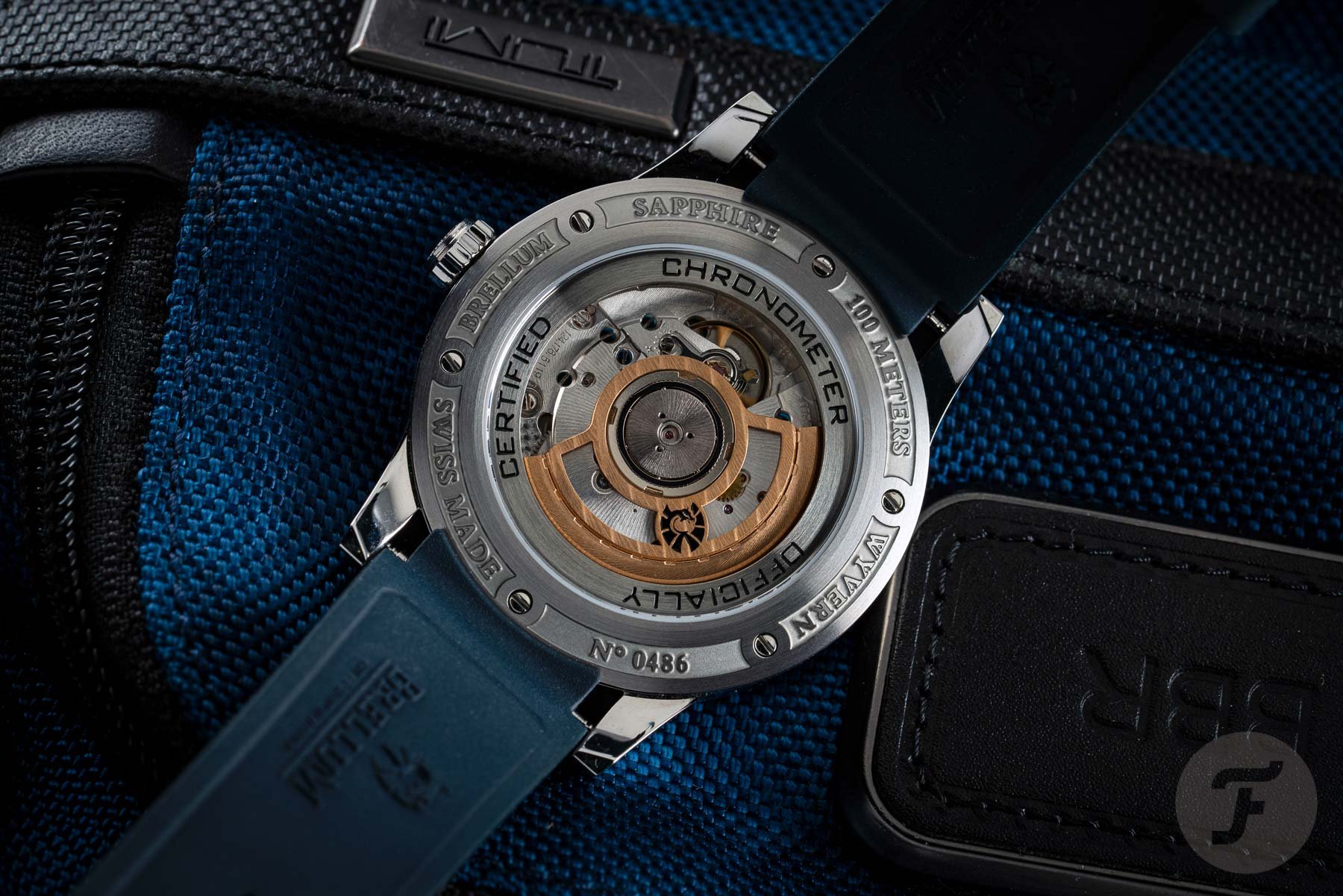 The automatic Brellum caliber BR-893-GMT can be seen through the watch’s sapphire exhibition case back. A skeletonized gold-colored rotor decorated with Geneva stripes and the brand’s Wyvern logo (a mythological dragon/bird/serpent hybrid from popular folklore) keeps the movement wound. The movement itself also features perlage and blued screws, so it really is something worth putting on display. The opening is relatively small compared to the size of the case. This means that Brellum had plenty of space to engrave some additional details onto the case back. The engraving is very nicely done, with the “Officially Certified Chronometer” text sitting under the crystal. In the space around the six screws that keep the back on the watch, you can find some additional information.
