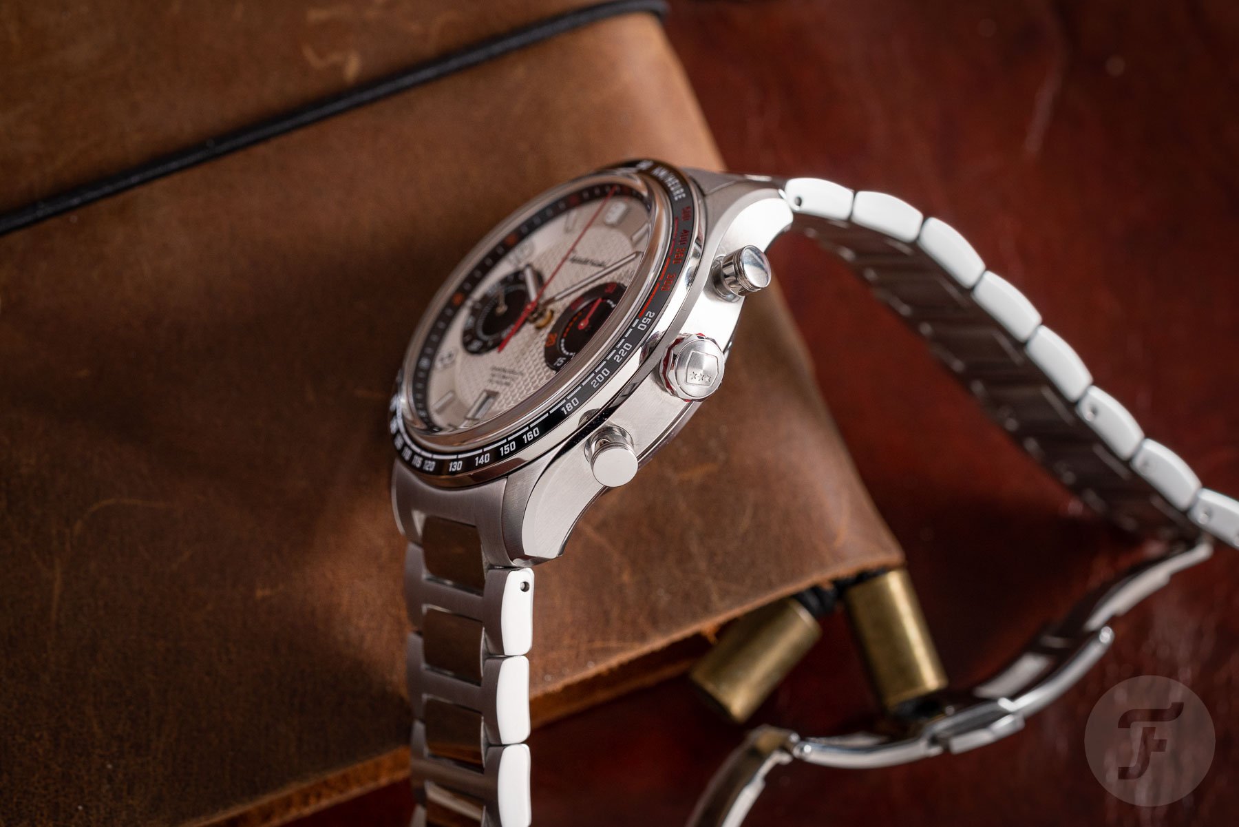 The one thing you will immediately notice when you pick up the watch is the heft. The Serie-A Allure measures 43mm in diameter and 15mm in height. The thickness is inevitable given the chronograph movement inside. The Depancel designers were conscious of applying polished bevels to the case to reduce bulkiness. The lugs also curve down to wrap around the wrist, which enhances wearability. Naturally, all this 316L stainless steel armor makes for a weighty final package. It sits well and looks good on the wrist nonetheless. The steel case is mostly satin-finished, while the H-link bracelet with a folding clasp features alternating brushed and polished finishes. But you can always swap it out for an embossed leather perforated racing strap with a pin buckle.