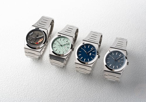 The watch debuts with three regular-production dials and one limited version. First up are the watches that aren’t limited by production. The Mint version features an oblong “pill” motif, a playful nod both to the “medical” color and to the capsule emblem at 3 o’clock. Then, there are Slate and Blue models. These watches’ dials showcase a linear texture inspired by the bracelet’s central links, tying the entire design language together. These two watches feature a complete, visually integrated look.