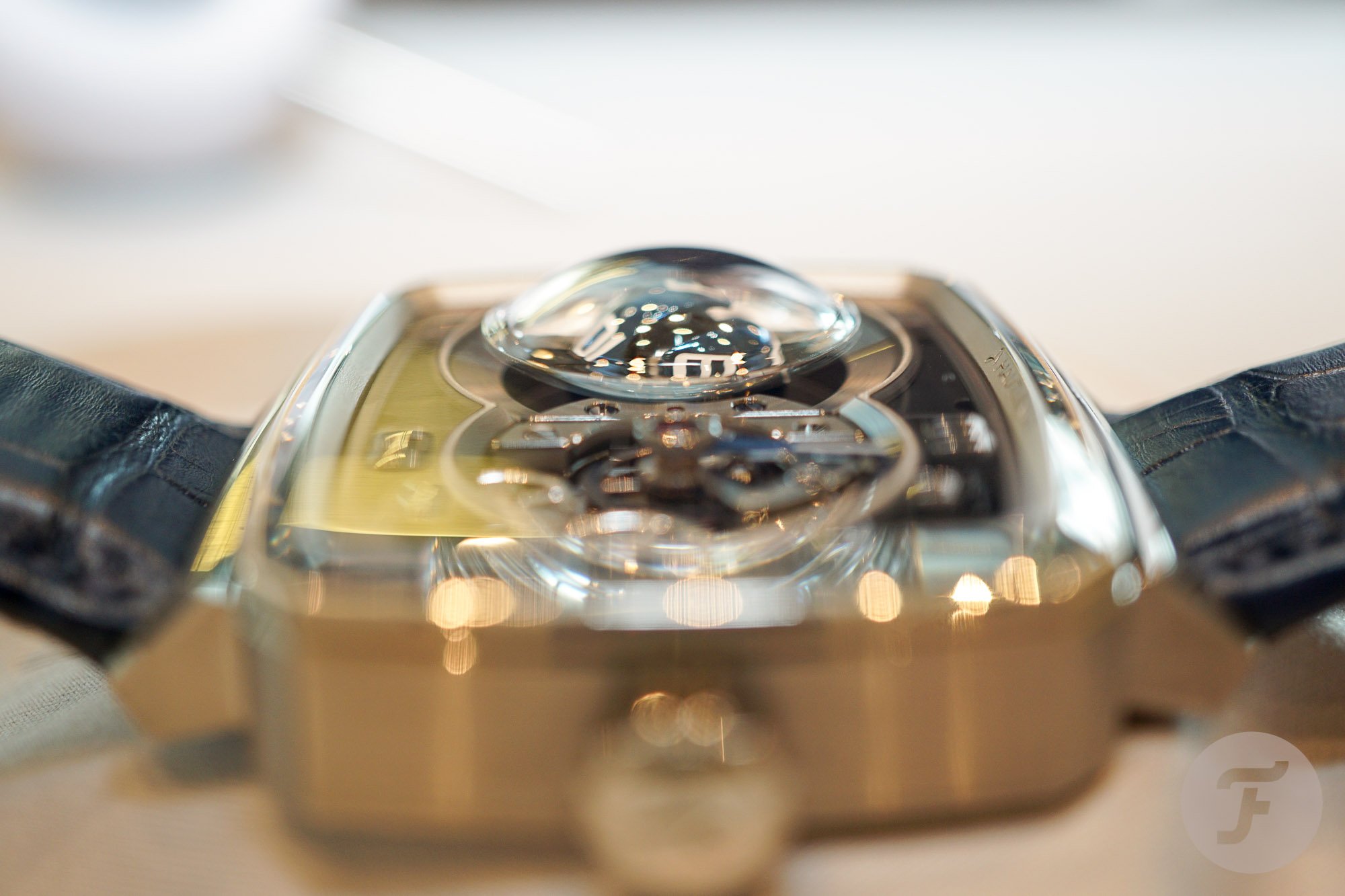 The most striking feature of the HL Sphere 01’s case is its shape. Obviously rectangular or as the brand calls it “TV screen shape” cases have been around for decades now. If you are a fan of Hautlence you might know that albeit they have released numerous watches with round cases, rectangular was the shape of their very first model. So, with this case design, the brand goes back to the signature model’s look. It is white gold with both polished and satin finished surfaces with a striking size of 39 by 46mm but only with 12mm thickness. That is excluding the dome that is part of the crystal, so it’s all one piece. A necessity to have enough space for the titanium hour sphere that “sticks out” of the otherwise flat movement. Despite the huge case the watch sits comfortably on the wrist, fits under a cuff.