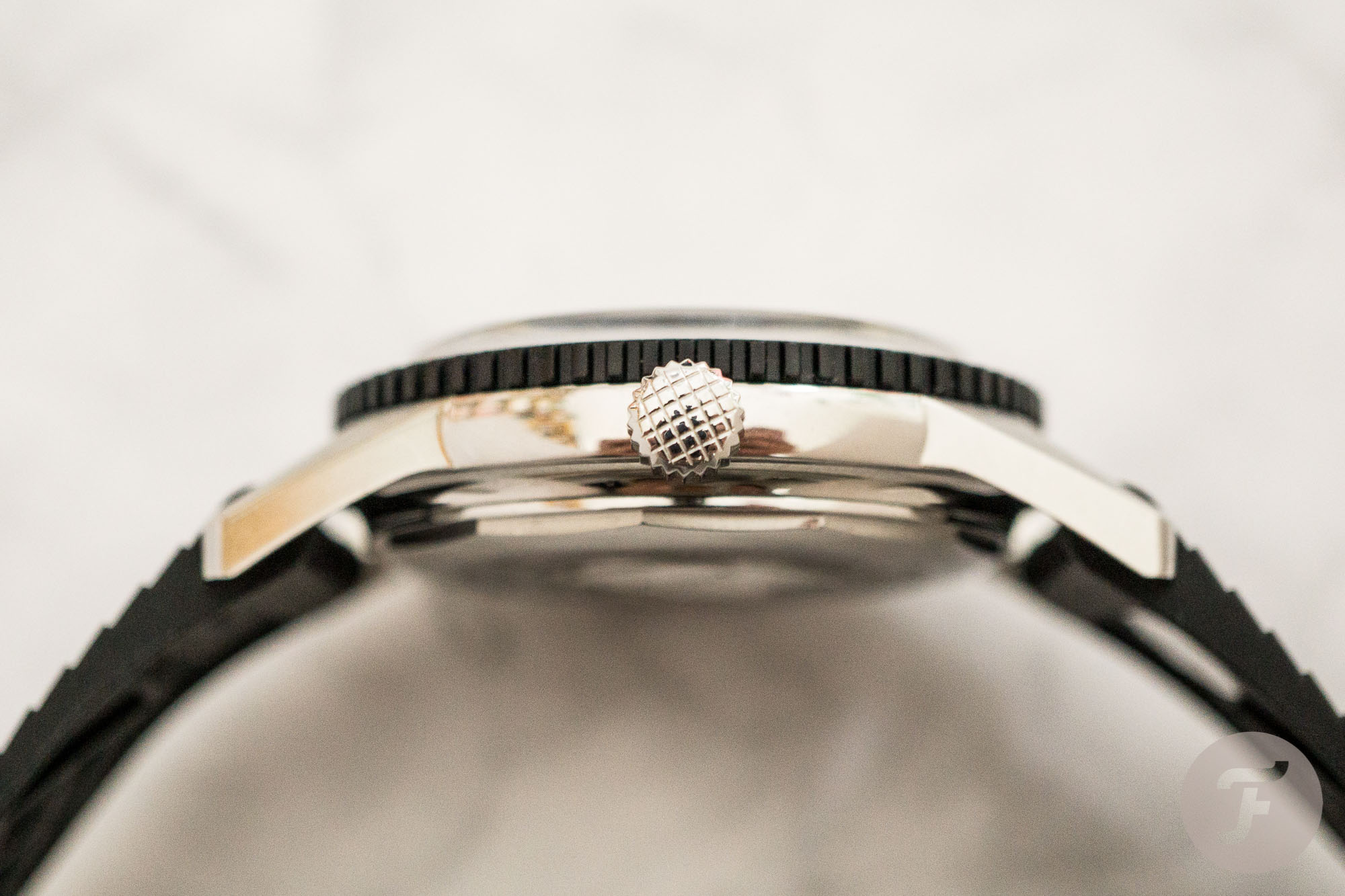 When it comes to the overall design of the watch it looks almost exactly like the vintage version. Including – fake – patina. I know many of you say, this would be the perfect watch if it did not have faux lume on the dial. I hear you and perhaps to a certain degree, I even agree with you. Having said that, I think in this case it helps to achieve an overall vintage look and actually matches the timepiece. To carry on with aged feel, the Skin Diver had a black grained dial. Some say it’s awesome, others think it’s too much. I personally like it, then again, I like the whole watch. The dial is huge, clean and easy to read. The indexes, the numerals (at 3-6-9-12) even the amount and position of the texts are identical to the old version.