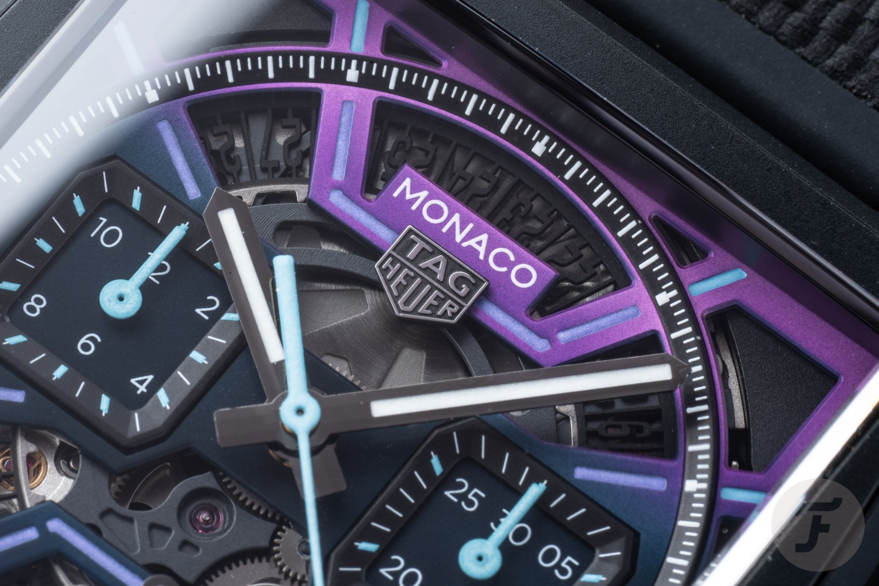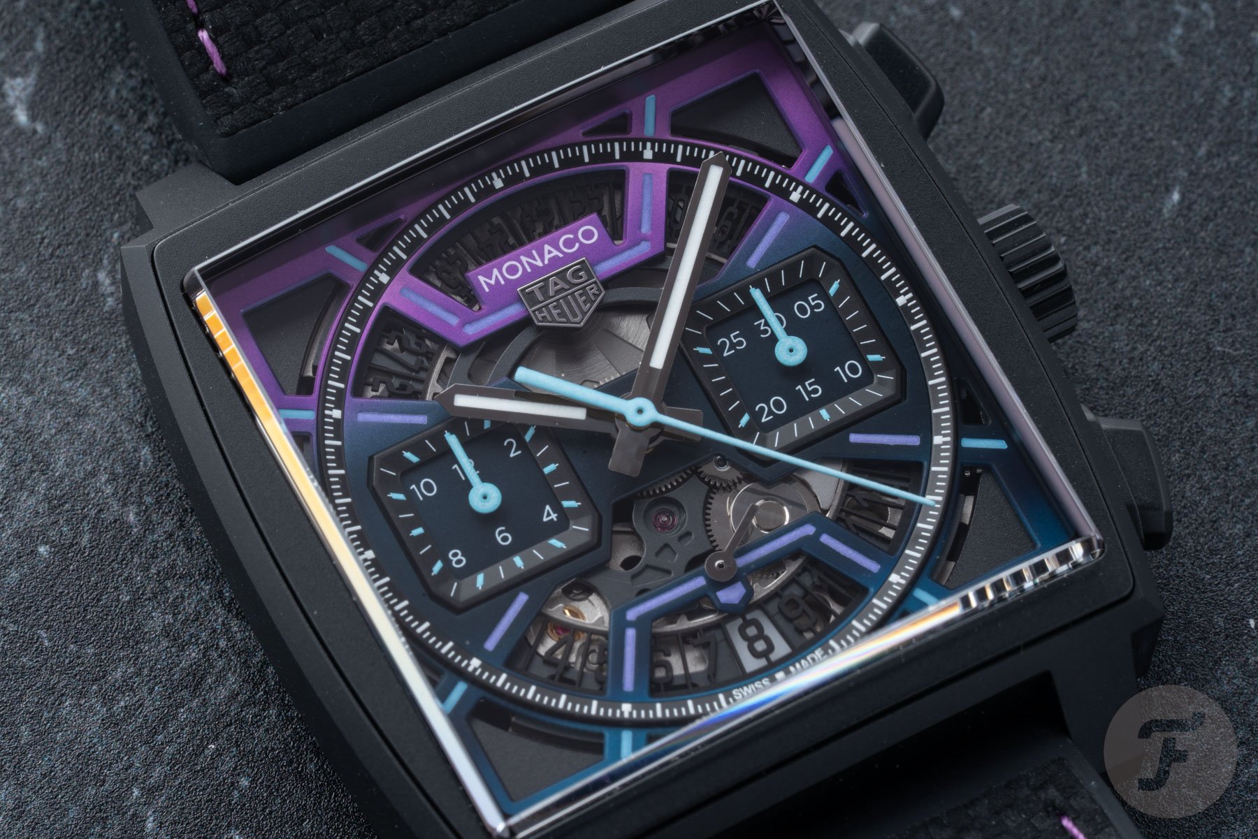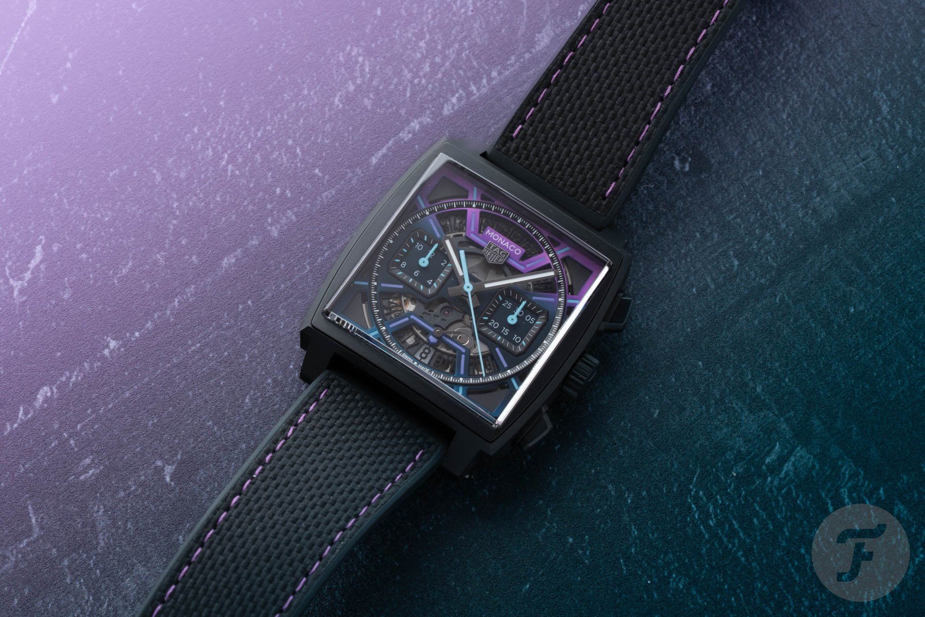 Why not release a new range of modern motorsports-inspired watches, preferably chronographs, with the name “Las Vegas”? The limited-edition TAG Heuer Monaco Chronograph for the Las Vegas Grand Prix 2025 made me think. Just like the Monaco Grand Prix, the Las Vegas Grand Prix, held since 2023, is a street course. Another similarity is that both places are centers of gambling. However, the Monaco Grand Prix is a traditional event, whereas the Las Vegas Grand Prix is still in the process of establishing its tradition. So come on, TAG Heuer, boost the race by honoring it with a watch! Please give us a square — or any wild geometric shape — TAG Heuer Las Vegas Chronograph next year. But first, we must take a closer look at this year’s new 600-piece limited-edition Monaco in its black square case, featuring neon purples and blues that mimic the colors of a nighttime race.