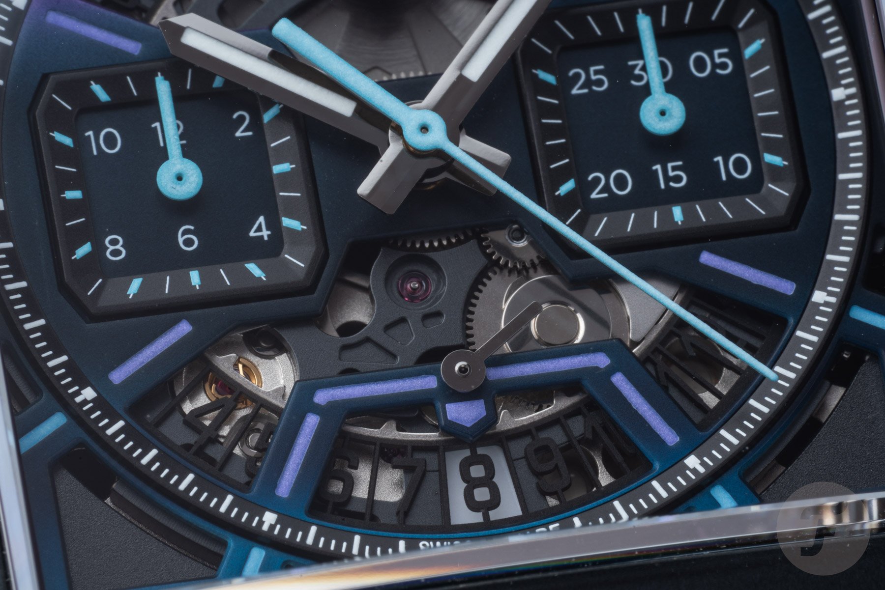 The open-worked date revealer is visible against a white, blue-glowing “SLN” background. Finally, purple and blue SLN on the inner arches of the skeletonized dial and outer edge, respectively, help create a glowing backlight.