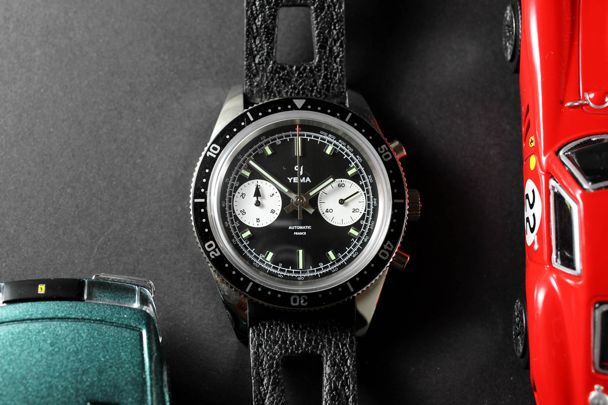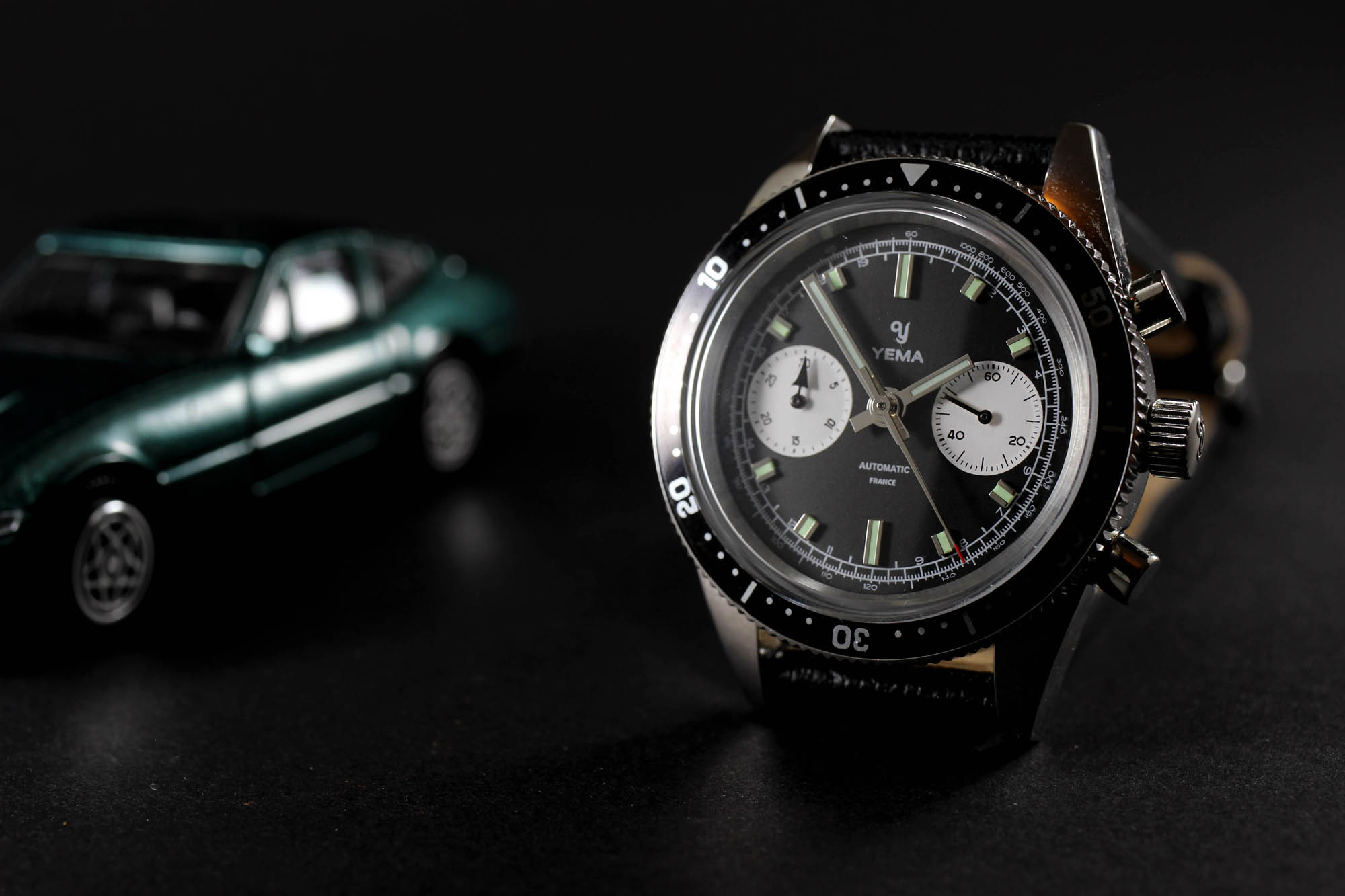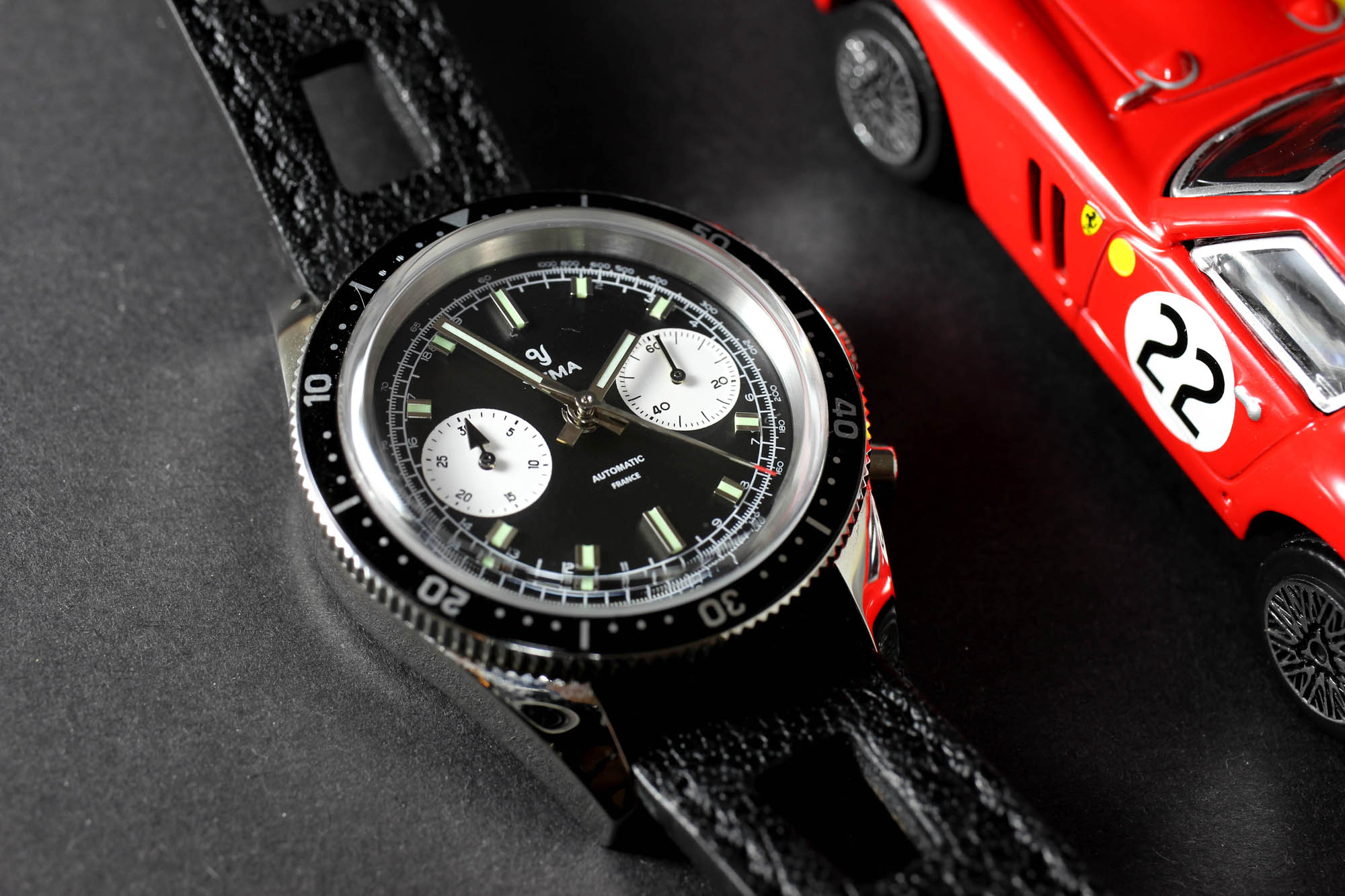The words Automatic and France are printed slightly higher than usual, and higher than on the original. I find it disturbing in a positive way. The hands are simple, admittedly a bit boring, but at least true to the original. They just got much more for Super-LumiNova C5 than 50 years ago. Applied markers with perfect luming give the dial more plasticity. The case back comes with a typically deep and solid engraving of a stylized Yema emblem. The rally racing vintage style strap is a bit thick but gentle. Most importantly, it made me feel more “Andretti” when driving my zero-performance 1984 VW Golf through the morning traffic.