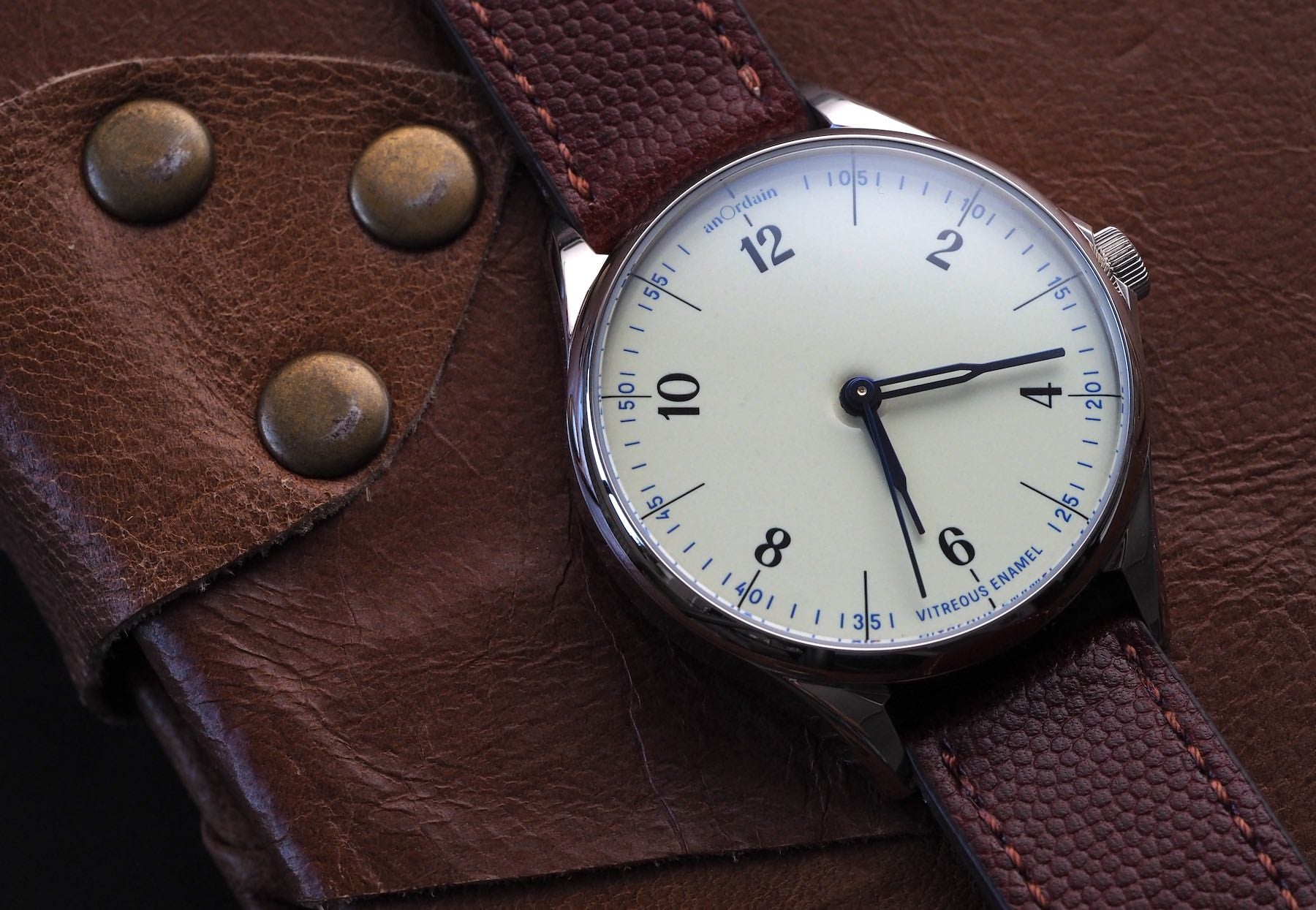 The first thing you see when you slide your anOrdain package out of the protective wrappings is the box. The box in this instance is a gray/cream thing with a blue lining. It has the anOrdain wordmark UV spot printed on the front in tiny letters. Those tiny letters are obscured by a brown “wrap” printed with a big number “1” on the front, and a small “synopsis” of what lay within on the back. It’s stunningly well done and a sign of things to come. Not to bury the lede here, what you get when you pay for an anOrdain watch is excellent typography and a beautifully executed enamel dial. If those aren’t your things, turn away now. If you like the sound of that, however, read on…