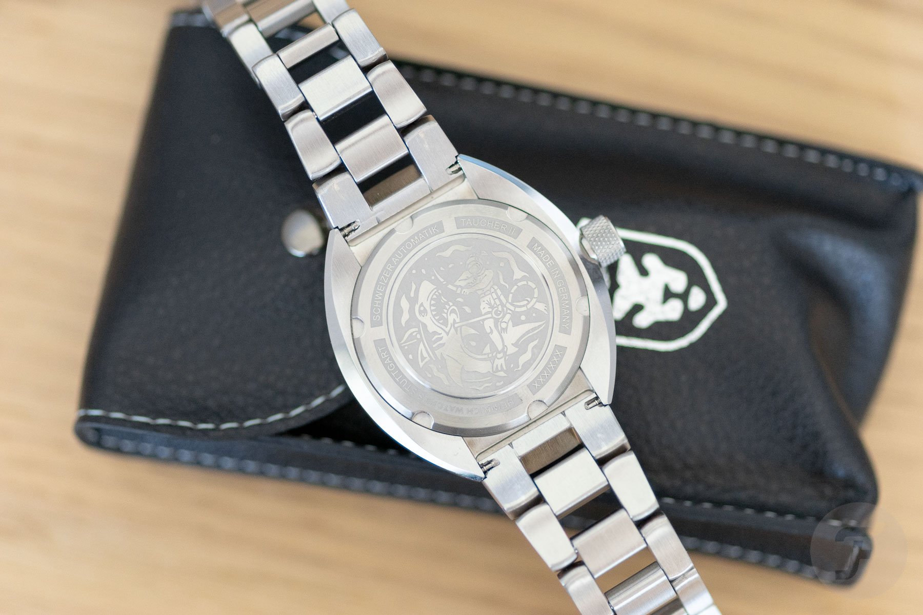Wolfgang Heinrich designed the watch by hand in Stuttgart. The first draft, still on paper, was then digitized step by step. Finally, he sent the design to the watchmaking city of Pforzheim, not even 50km away. There, just like the Taucher, the Taucher 2 is also manufactured. The 45-year-old Heinrich credits the diving watches of the ’70s such as Certina and Doxa as his inspiration. We can find the ’70s watch DNA on the case back. A laser engraving of a diver fighting a shark is there to allude to the diving magazines of the decade. It’s the fight of the small against the big, similar to microbrands fighting against industry giants. With the corona pandemic and uncertain economic times, the little ones get eaten faster and have difficulty surviving in the big shark tank.