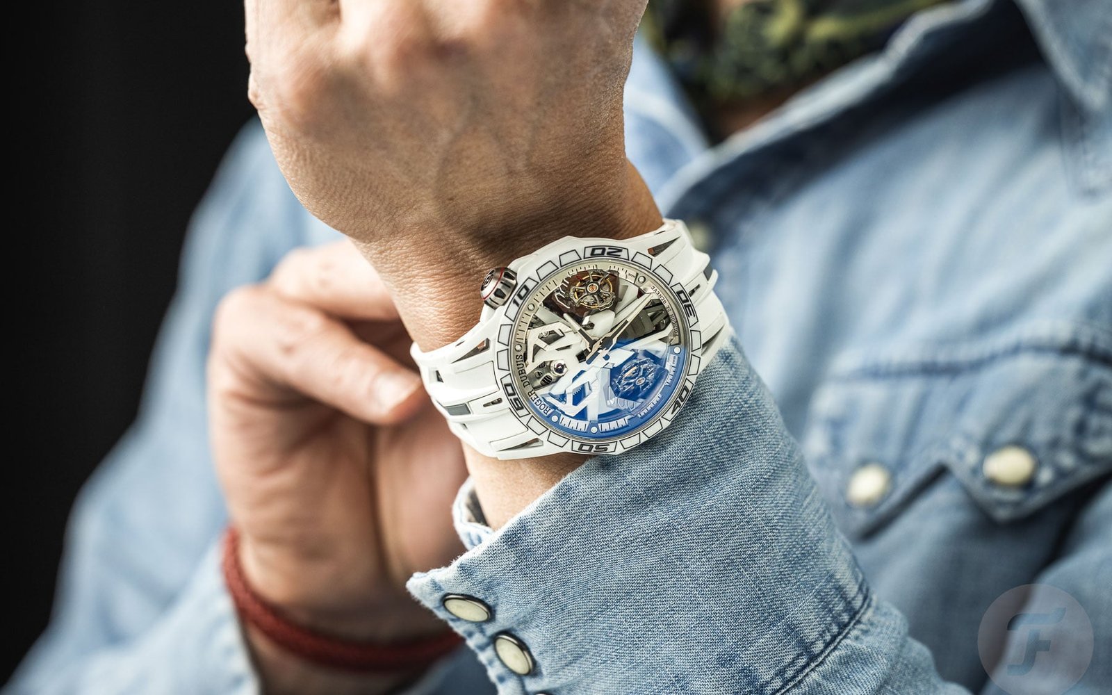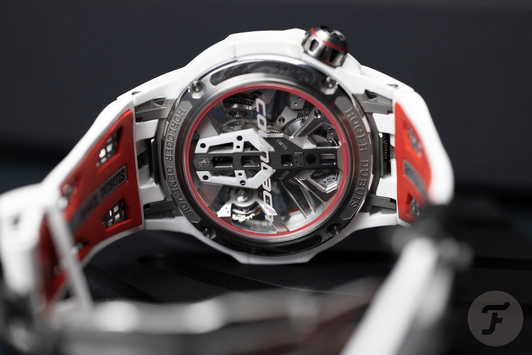 Yes, the watch is big, but the multi-piece rubber strap with fabric mesh inserts and a quick-release titanium clasp keeps it firmly on the wrist. It felt smaller than the Excalibur Eon Gold that I tried a while back. It didn’t look small, though. The 47 × 16.45mm case is, of course, already size XL, and since the color white doesn’t exactly slim things down visually, the watch looks massive on the wrist. Massively impressive too. And that’s exactly what it wants to do — impress. It does so with many “Lambo” design details and a V-twin tourbillon power unit. This super exotic and rare creation will turn heads wherever and whenever it rolls into view.
