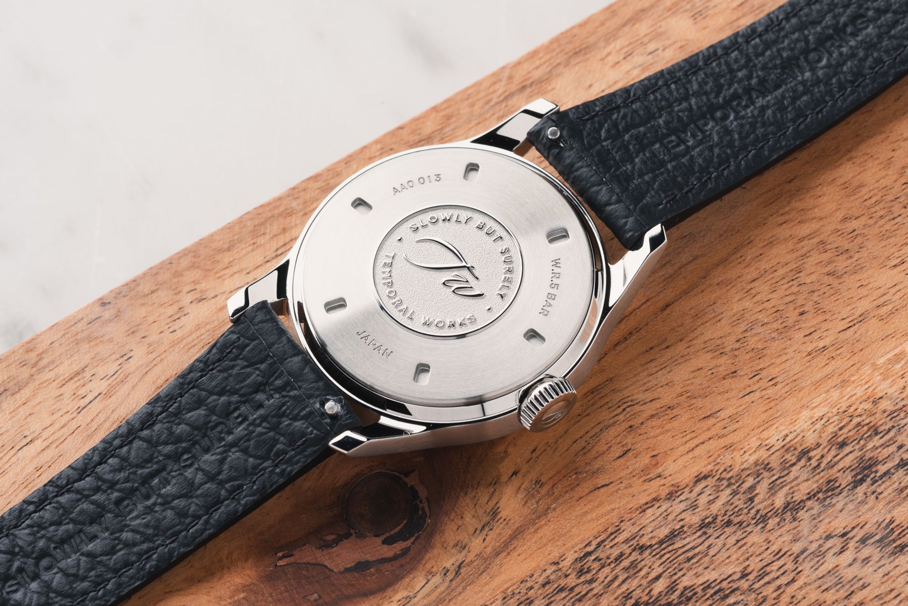 The movement inside the Temporal Works Series A is Sellita’s SW210-1. This hand-wound caliber has a 42-hour power reserve and ticks at 28,800 vibrations per hour. Additionally, Temporal Works ensured the use of the D4 iteration of the SW210-1. Sellita uses the D1 to D4 designations to indicate the level of finishing and decoration of its movements, with D1 being the most standard. D4 is the most elaborate, featuring Côtes de Genève on the bridges, perlage decoration on the base plates, and brushed wheels. Last but not least, the SW210-1 D4 iteration also uses blued screws. The movement is not visible, as Temporal Works decided to use an all-steel case back; however, at least you know that this movement has undergone some additional work.