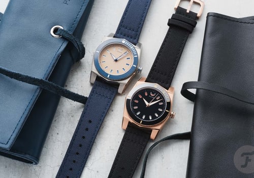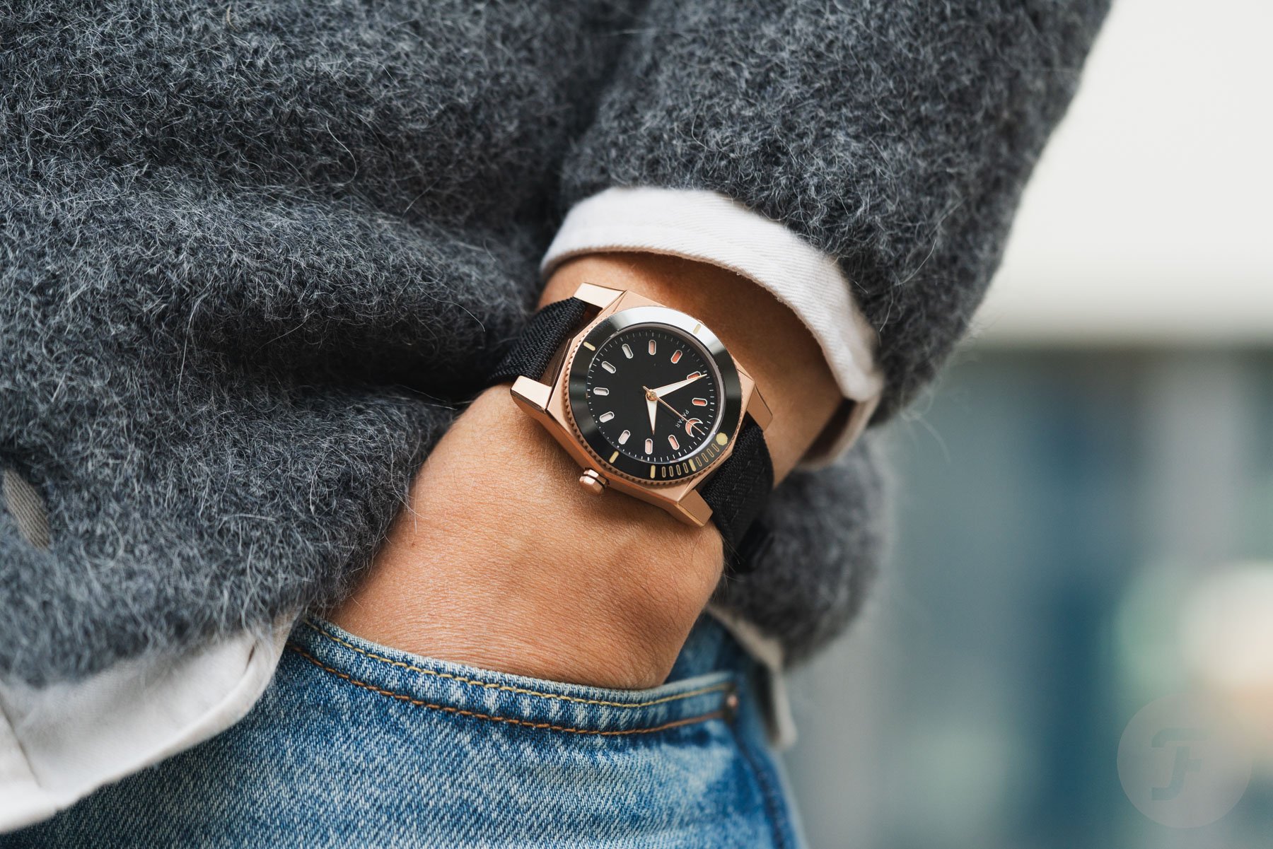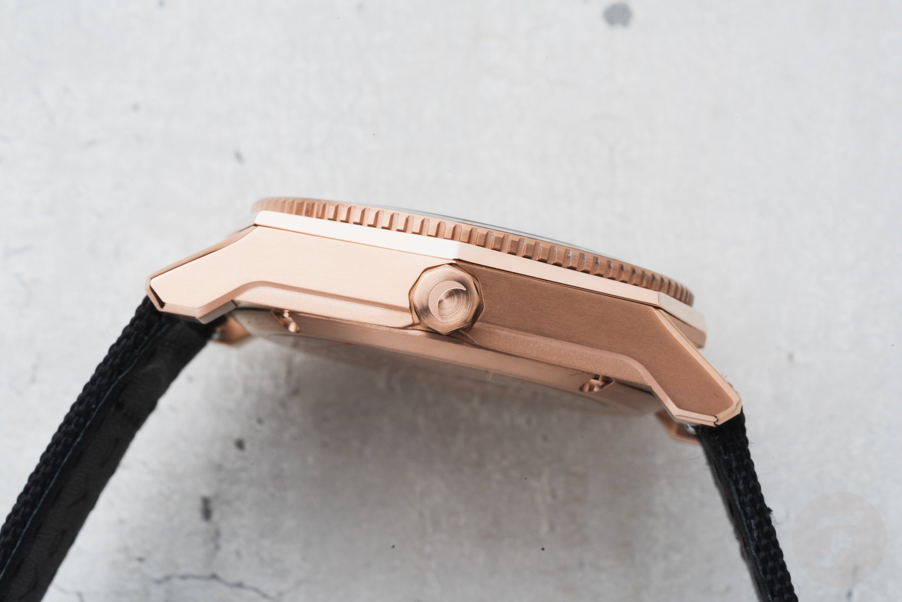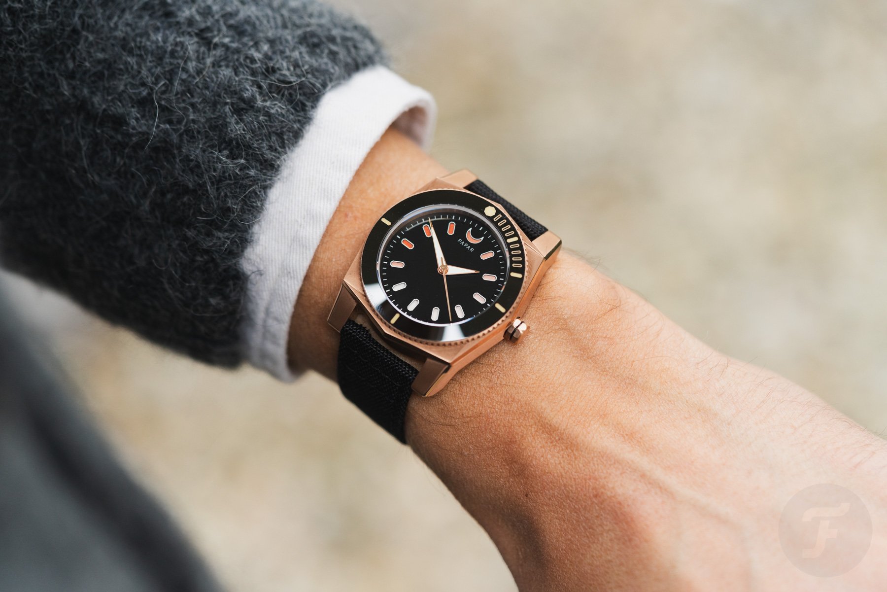 You could certainly dive into a cenote with either iteration of the Cenote on your wrist, as these watches both have a 200m depth rating. Each colorway is limited to 100 numbered pieces, and they’re available now on Papar’s website. The 40mm case, with a 10.9mm thickness and 47mm lug-to-lug, is muscular and faceted, and it looks contemporary industrial when executed in gray titanium. With a rose gold PVD coating, however, it appears more 1970s retro-futuristic. The Cenote is not your run-of-the-mill dive watch, but it’s also not as controversial as the Anillo GMT that got the ball rolling for Papar.
