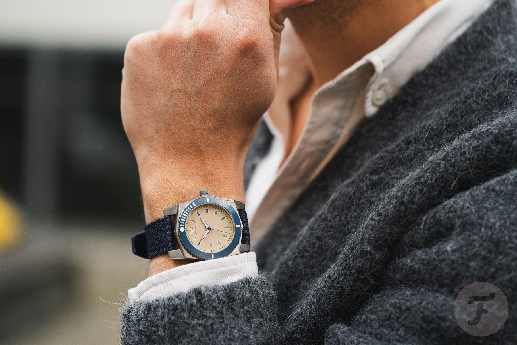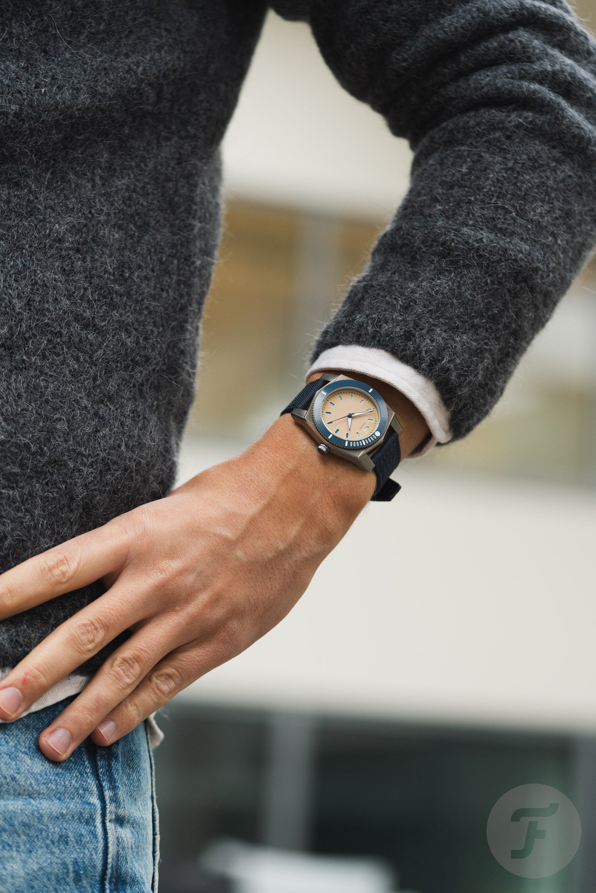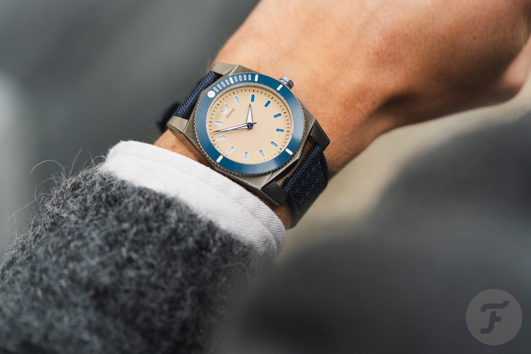 The first thing I noticed when wearing either Cenote is that the watch has presence on the wrist. The cool Titanium + Blue model, with its blue sailcloth strap and titanium pin buckle, is the more outspoken of the two. Brushed gray titanium, combined with a matte blue 120-click unidirectional dive bezel, says “tool watch” in a compelling voice. The beige Super-LumiNova fumé dial is something special, and Papar claims it’s the first of its kind. Its beige tone softens the design in the light, and dynamic indexes shift color from a medium to a very light blue. In the dark, though, the dial’s lume glows brightest on the perimeter and slowly but surely fades toward the center. It’s a fascinating site, a treat for its wearer, and a nice talking point at the same time.
