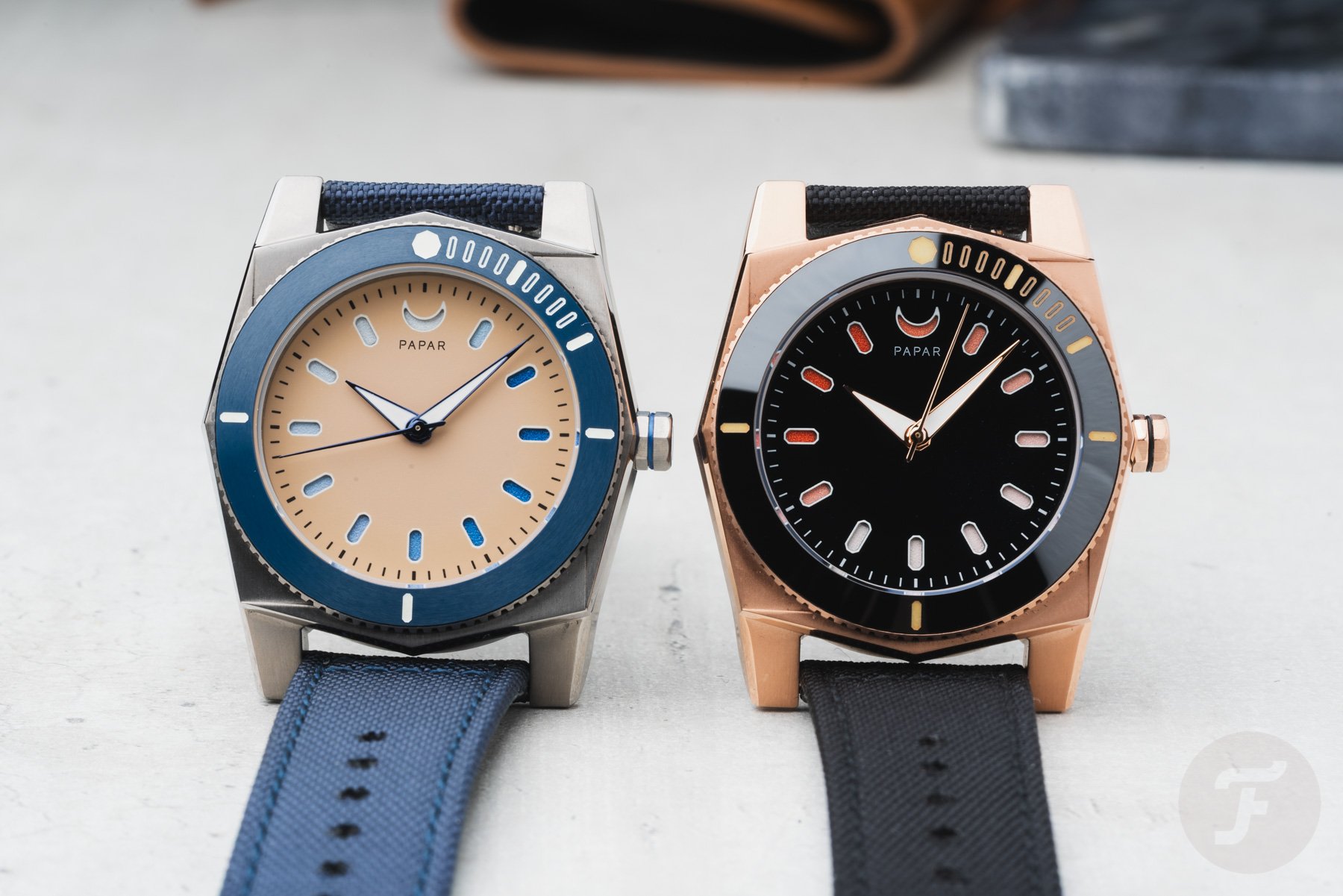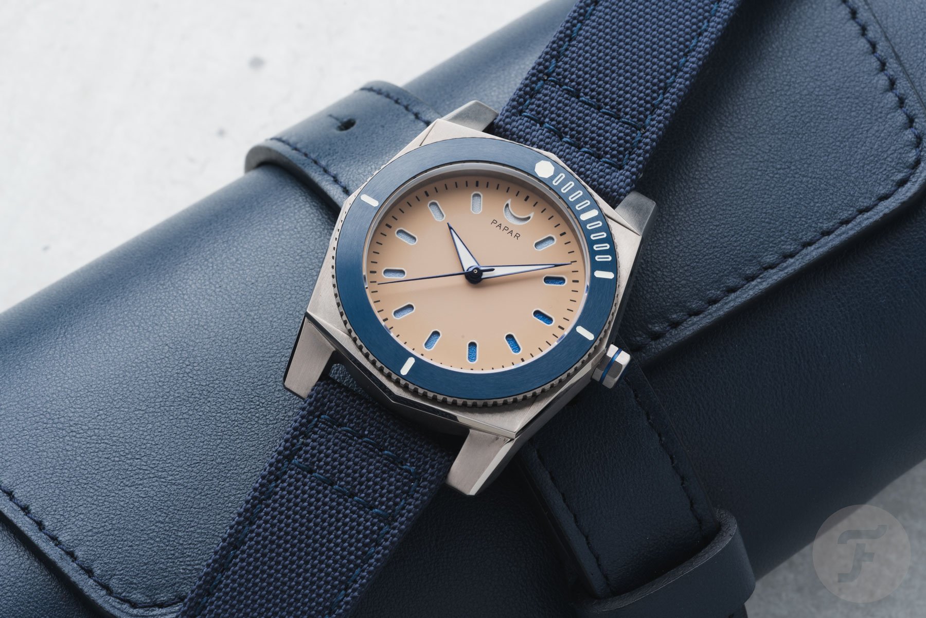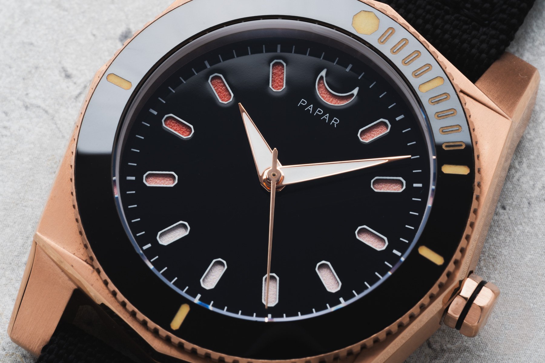 The Papar Watch Company is the brand of husband-and-wife duo Josh (the designer) and Emily (the chief creative officer). The brand operates from the Berkshire Mountains of Massachusetts, and the name Papar has roots in Mexico, where the brand was originally founded. Emily and Josh find inspiration in vintage watch design, brutalist architecture, and — please believe this — paper planes. The name is a combination of papel, meaning “paper,” in Spanish, and doblar, meaning “to fold” in the same language. You can indeed see the “folded” shapes of the Anillo’s case and, to a lesser extent, in the Cenote.
