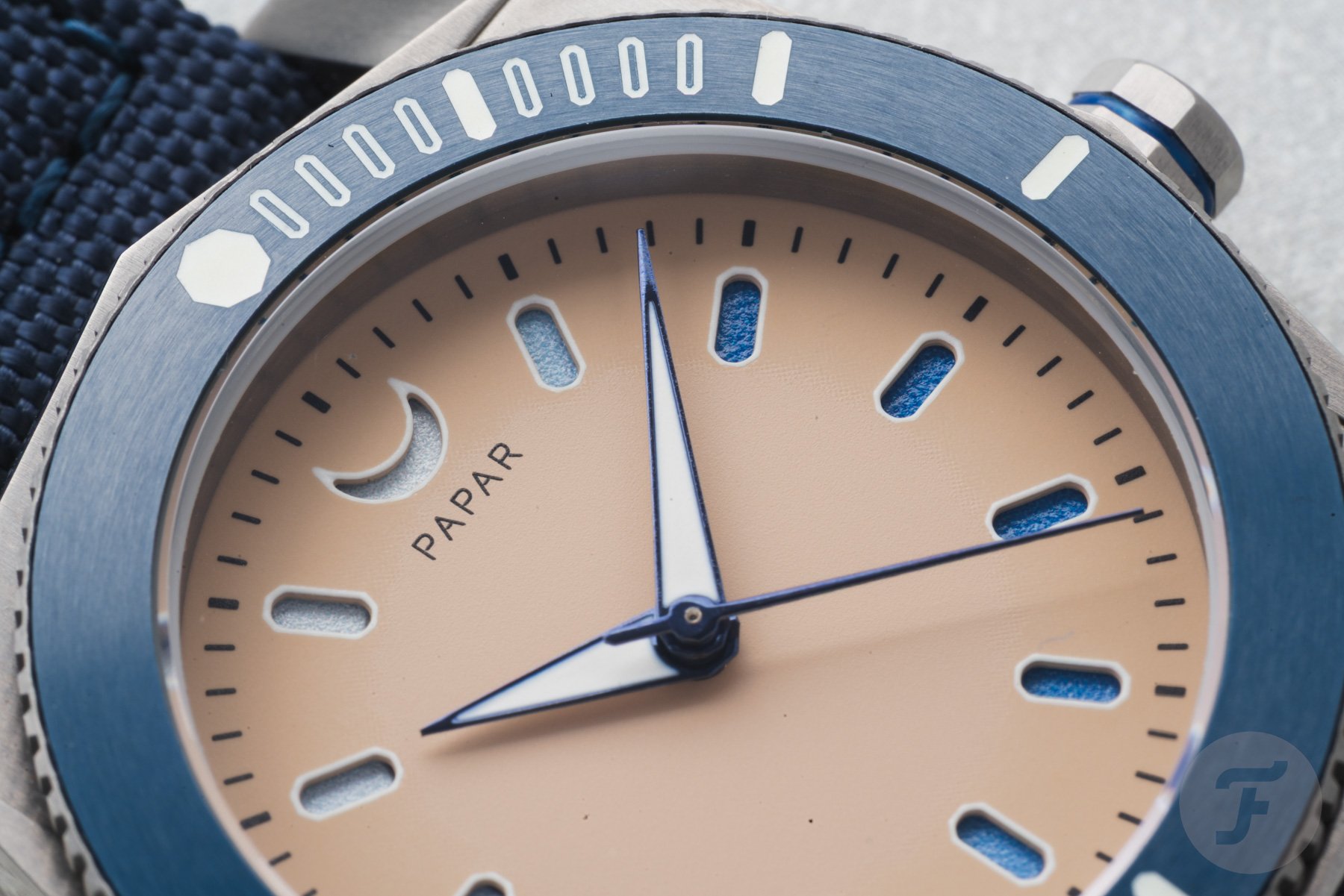 The automatic 4Hz Miyota 9015 powers a color-gradient date disc. Instead of 31 dates, you get various shades of blue or pink, changing the mood of your Cenote in a natural rhythm. It’s an evolution of Papar’s trademark color-changing logo, which debuted on the Anillo GMT, and it adds yet another touch of out-of-the-box creativity and fun to a type of watch everyone is very familiar with. Is a color-changing disc functional? No, it isn’t. Is it different? Yes, it is, and it’s also fun.
