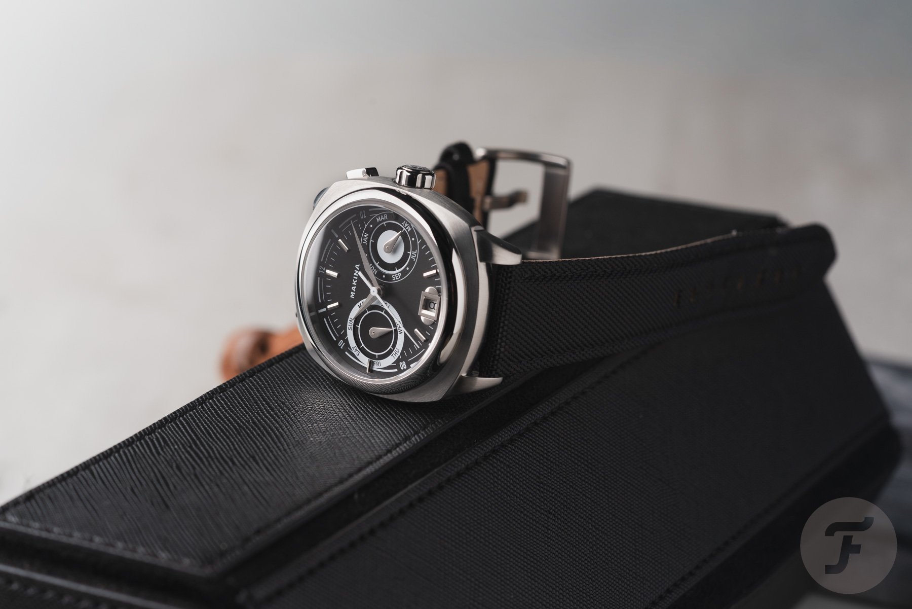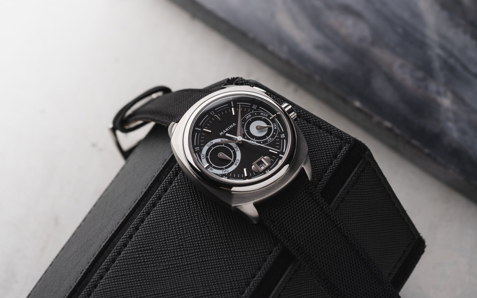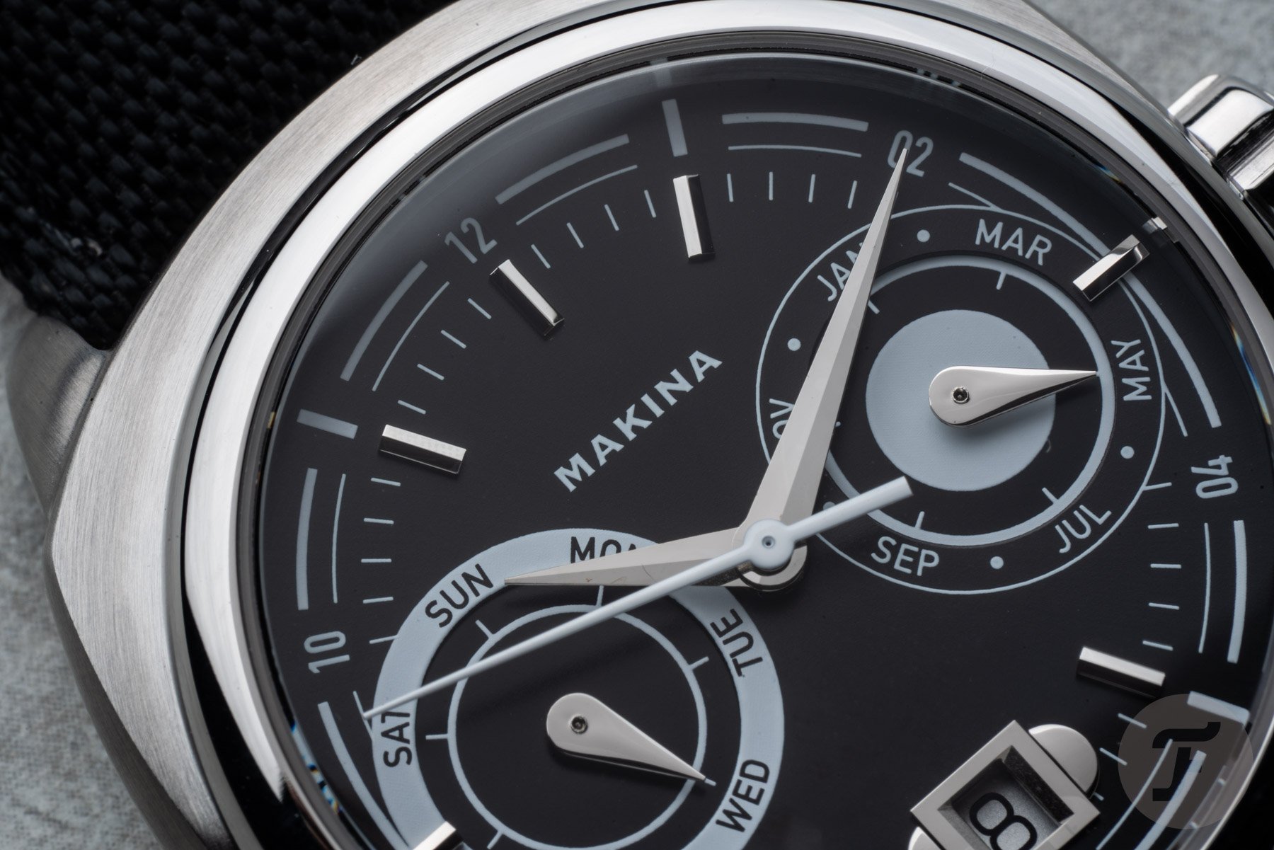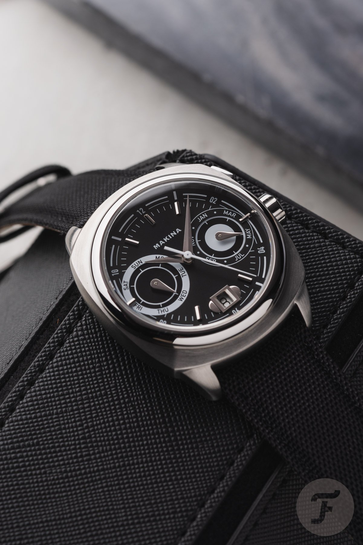 One quick look at the pictures, and you will see that the new Makina Uriel_VII is a charming watch with a cushion-shaped case and the looks of a late ’60s or ’70s chronograph. But look again, and you will see that it’s actually not a chronograph. The two sub-dials, in fact, display the days and months. Add the date at 6 o’clock, and you have triple-calendar functionality. This calendar display is far from new, but it’s fun to see here because it’s not so common these days, especially among more affordable offerings.
