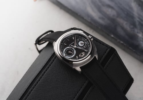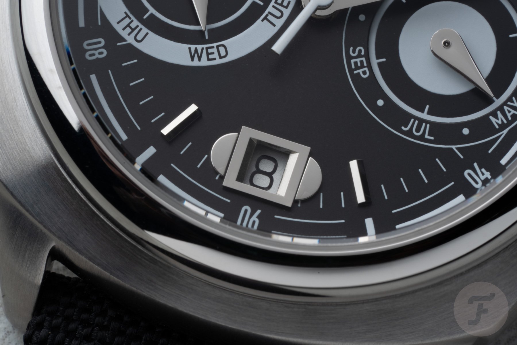 The case is paired with an asymmetrical satin-black brass dial featuring a refined texture. At first glance, there is a lot to take in, but the different pieces of the puzzle quickly begin to fall into place. It starts with the white double-lined chapter ring that holds a 12-hour scale. Moving inward from there, we find polished and faceted applied hour markers placed among a minute scale printed in white. Located at 3 o’clock is a sub-dial for the months, and at 9 o’clock, another sub-dial displays the days.
