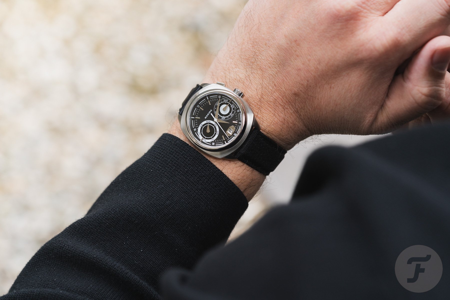 Both sub-dials are slightly recessed and executed in panda and reverse-panda color schemes with teardrop-shaped hands hovering over them. Lastly, the framed date display at 6 o’clock completes the calendar functions. Turning above the dial are centrally mounted, sharp-looking dauphine hour and minute hands, as well as a nicely contrasting white needle-shaped seconds hand.