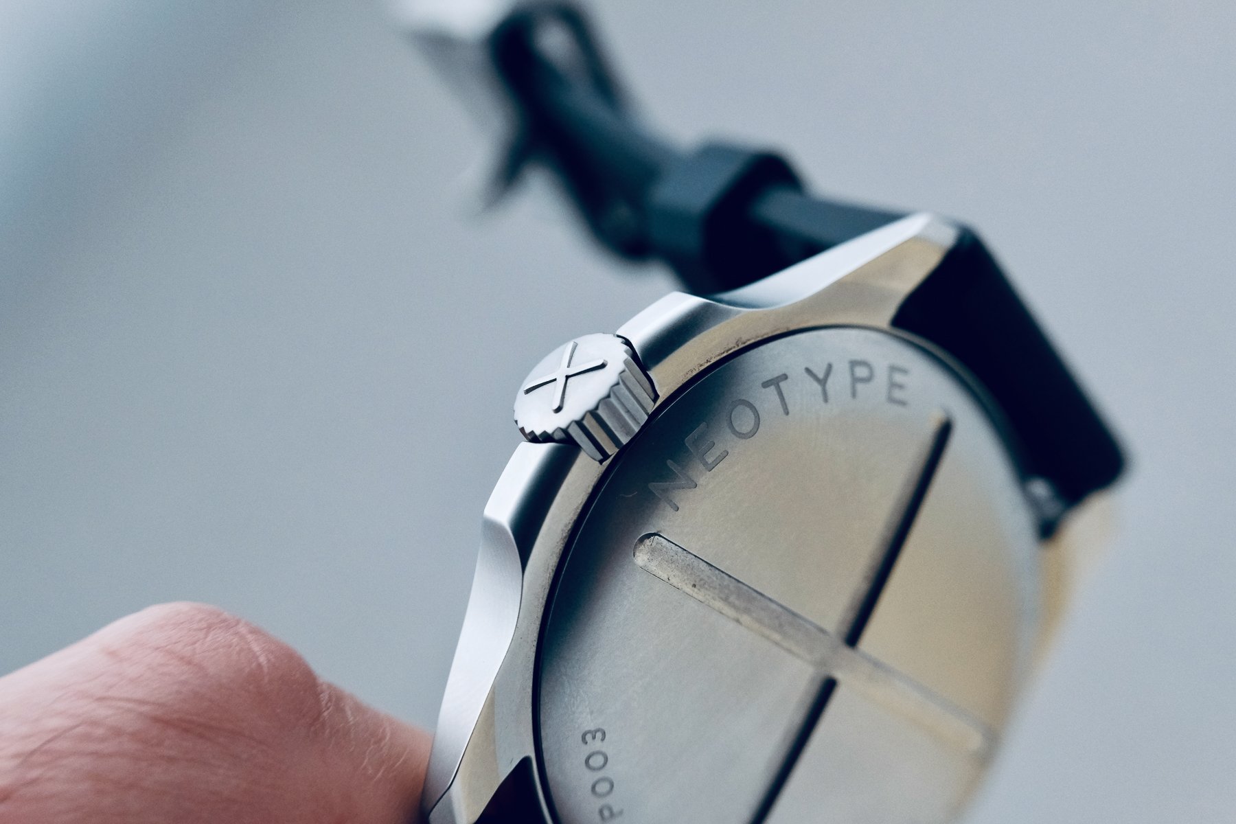 The aesthetic simplicity of the design is echoed in several places on the LM01, from the dial layout, which we just looked at, to the case back and crown. The former shows a deeply etched “X” running across it while the crown repeats this pattern in relief. Just like the two friends chose the name Neotype for its simple definition and ease of pronunciation in most languages, they stuck with a simple yet effective visual language.