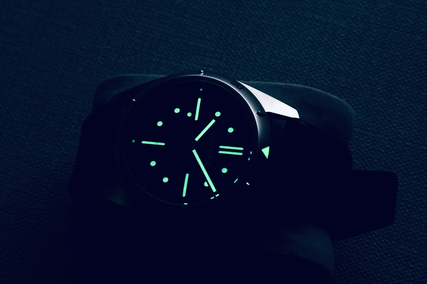The LM01 offers a Panerai-ish dial layout in the way that it looks bare and geometric. To read time, the wearer only has to look at the baton-style and dot-shaped markers and how the half-blacked-out hands meet them at the right spot. There is a discreet minute track that sits slightly higher than the center portion of the dial. This and the “sandwich” lume markers add a subtle sense of three-dimensionality. Text is kept to a minimum with “Neotype” at the 12 o’clock position and the words “Automatic” and “300M / 1000ft” at the 6 o’clock position.