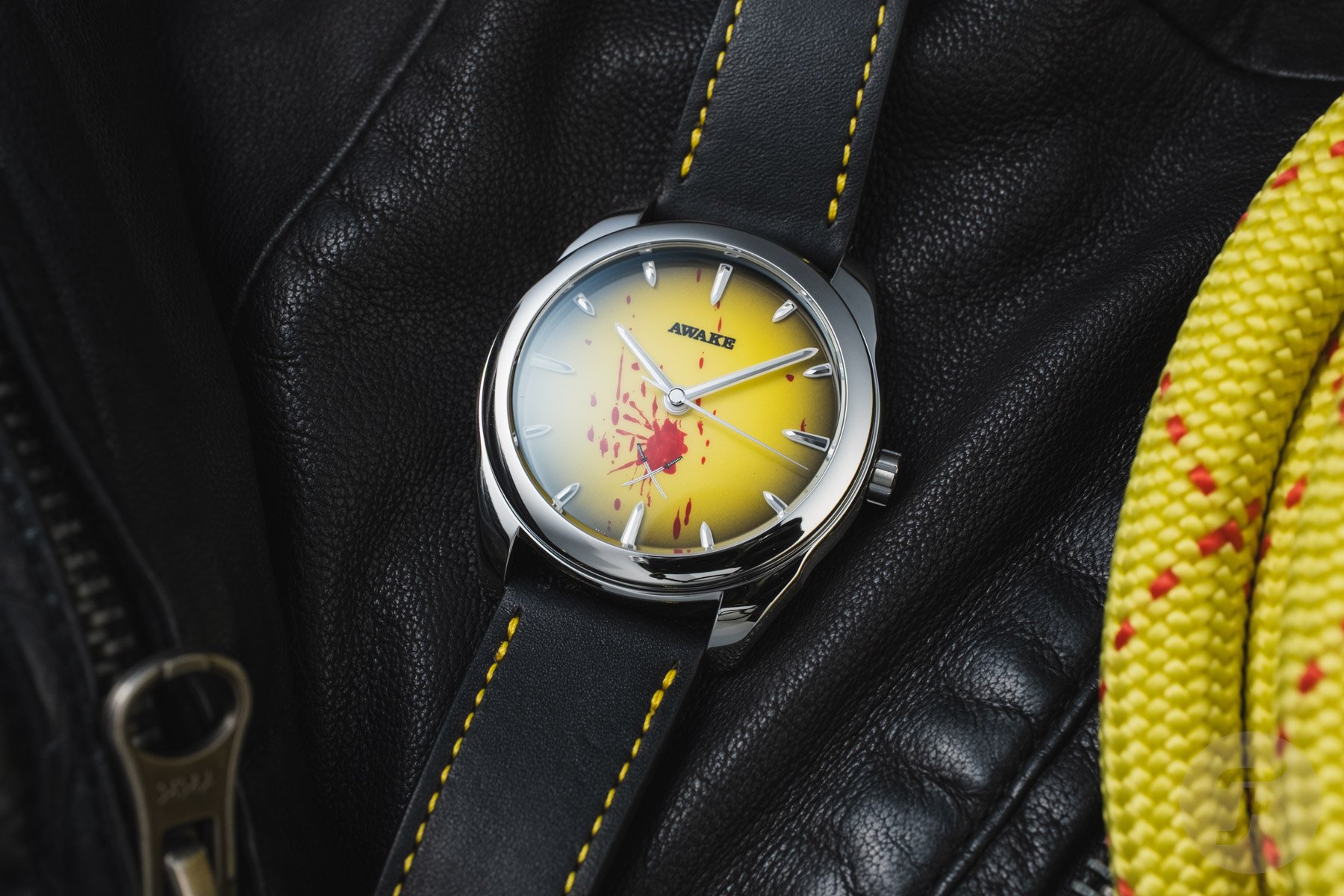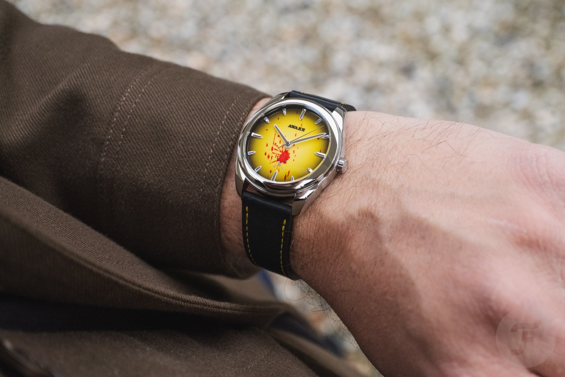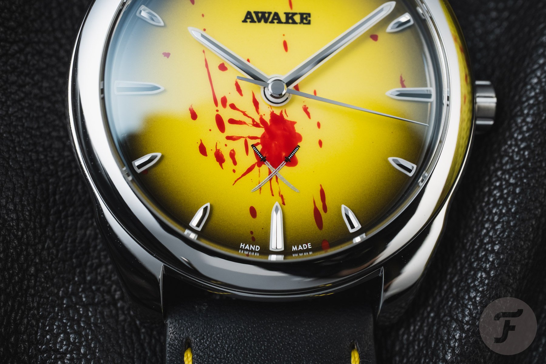 The Deadly Watch continues Awake’s experimentation with Vietnamese Sơn Mài lacquer. We’ve discussed this painstaking multi-step process in detail before, and it continues to impress. Unlike other models in the collection, this limited edition features a stunningly smooth yellow dial with a gradient effect. Both of these colors are prominently featured in Kill Bill, especially on Thurman’s character’s signature leather jumpsuit. The edges are in black, and while these two tones couldn’t be more different, the effect is seamless. The brand’s tooth-like applied indexes are on display with Super-LumiNova BGW9 underlays. However, there’s a change to the logo that heralds all the different film-related details.