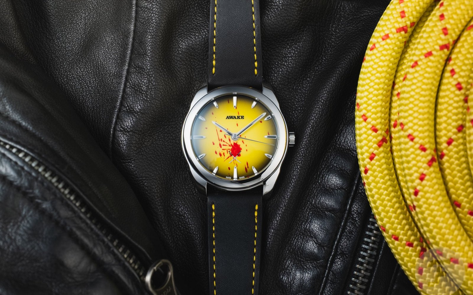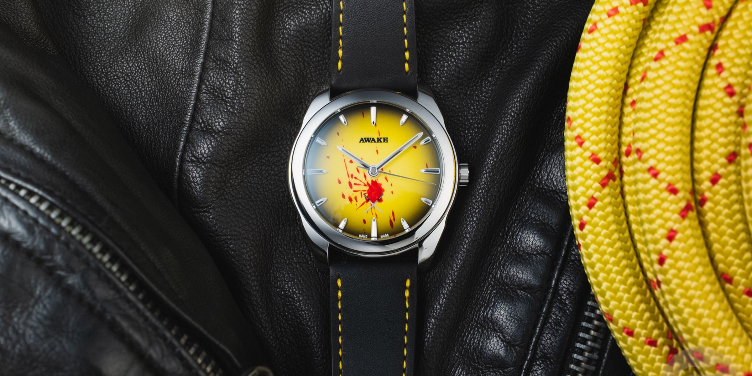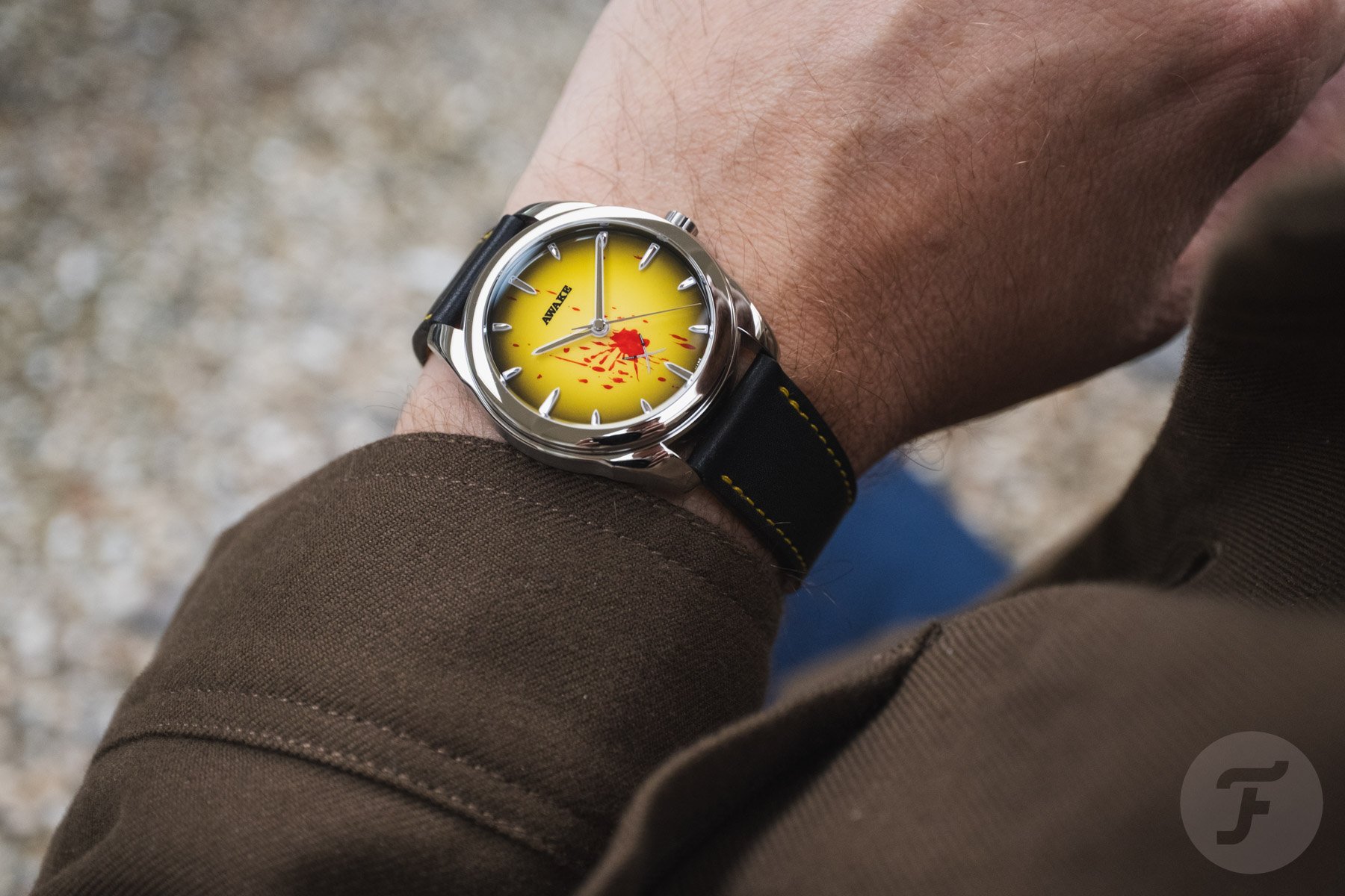 The Deadly Watch continues Awake’s experimentation with Vietnamese Sơn Mài lacquer. We’ve discussed this painstaking multi-step process in detail before, and it continues to impress. Unlike other models in the collection, this limited edition features a stunningly smooth yellow dial with a gradient effect. Both of these colors are prominently featured in Kill Bill, especially on Thurman’s character’s signature leather jumpsuit. The edges are in black, and while these two tones couldn’t be more different, the effect is seamless. The brand’s tooth-like applied indexes are on display with Super-LumiNova BGW9 underlays. However, there’s a change to the logo that heralds all the different film-related details.
