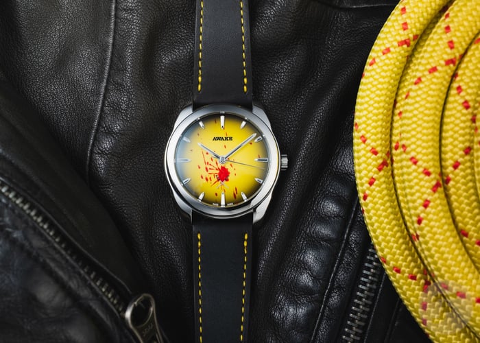 The Awake logo uses a pad-printed Western-themed font, an ode to Tarantino’s love of the film genre. Then, the dial features red blood splatters made from lacquer. Anyone who has seen the movies won’t require an explanation for what these symbolize. Finally, a pad-printed display of two Japanese katanas has been added above the index at 6 o’clock. Here again, these are a reference to the Hattori Hanzo swords used by David Carradine’s character, Bill, and Beatrix Kiddo.